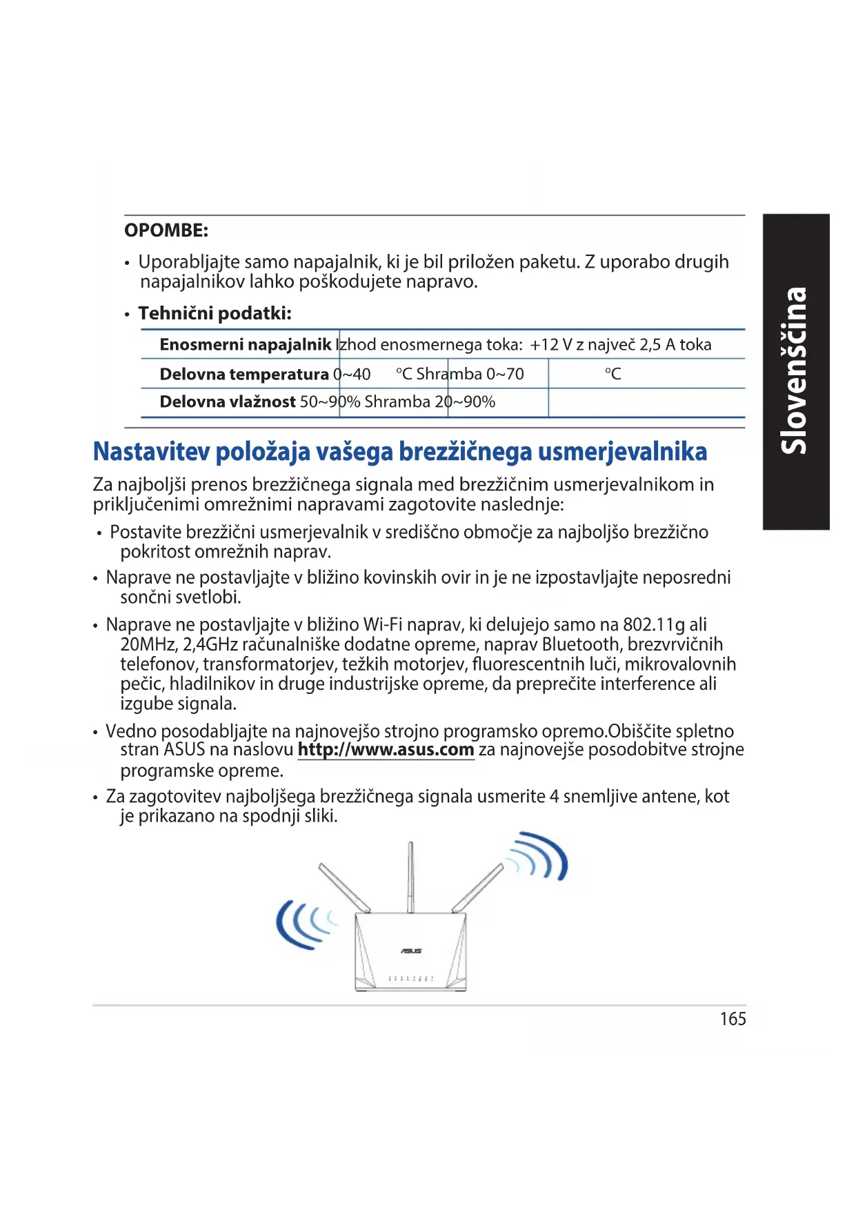 - Naprave ne postavljajte v bližino Wi-Fi naprav, ki delujejo samo na 802.11g ali 20MHz, 2,4GHz računalniške dodatne opreme, naprav Bluetooth, brezvrvičnih telefonov, transformatorjev, težkih motorjev, uorescentnih luči, mikrovalovnih pečic, hladilnikov in druge industrijske opreme, da preprečite interference ali izgube signala.
