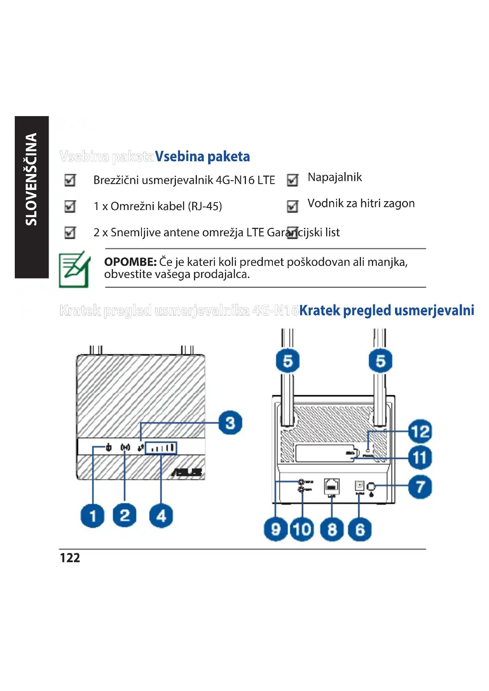 Prevádzková vlhkosť ≤ 90% Pamäť ≤ 95%122 SLOVENŠČINA OPOMBE: Če je kateri koli predmet poškodovan ali manjka, obvestite vašega prodajalca. Vsebina paketaVsebina paketa Brezžični usmerjevalnik 4G-N16 LTE Napajalnik 1 x Omrežni kabel (RJ-45) Vodnik za hitri zagon 2 x Snemljive antene omrežja LTE Garancijski list Kratek pregled usmerjevalnika 4G-N16Kratek pregled usmerjevalnika 4G-N16 Slovenščina123 SLOVENŠČINA Namestitev usmerjevalnika Namestitev usmerjevalnika