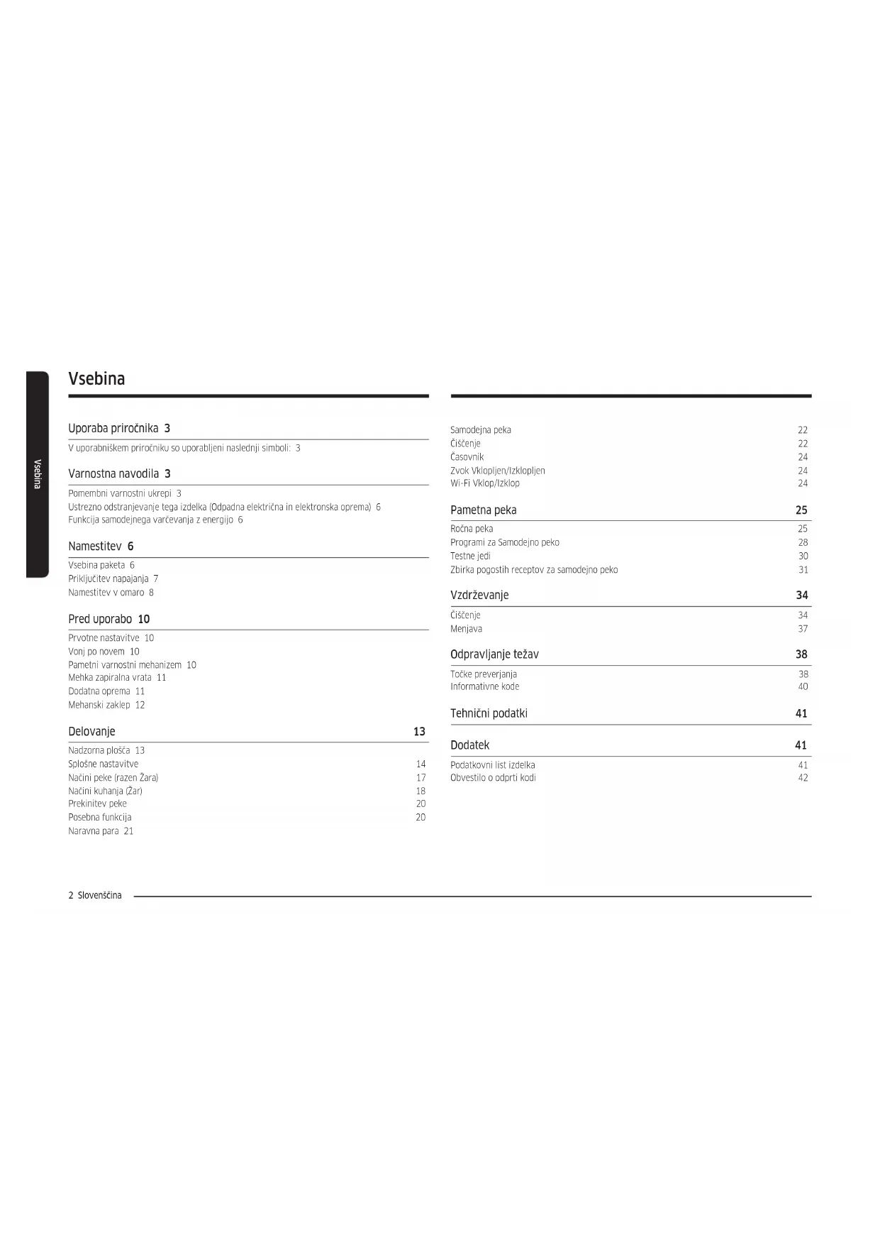 - (opłata według taryfy operatora) http://www.samsung.com/pl/support/ ROMANIA 0800872678 - Apel gratuit *8000 - Apel tarifat în reţea www.samsung.com/ro/support SERBIA 011 321 6899 www.samsung.com/rs/support SLOVAKIA 0800 - SAMSUNG (0800-726 786) www.samsung.com/sk/support LITHUANIA 8-800-77777 www.samsung.com/lt/support LATVIA 8000-7267 www.samsung.com/lv/support ESTONIA 800-7267 www.samsung.com/ee/support SLOVENIA 080 697 267 (brezplačna številka) www.samsung.com/si/support KOSOVO 038 40 30 90 www.samsung.com/support DG68-01414C-01Vgradna pečica Priročnik za uporabo in namestitev NV7B411**** / NV7B412**** / NV7B413**** / NV7B414**** / NV7B415**** / NV7B411**C* / NV7B412**C* / NV7B414**C*2 Slovenščina Vsebina Vsebina Uporaba priročnika 3 V uporabniškem priročniku so uporabljeni naslednji simboli: 3 Varnostna navodila 3 Pomembni varnostni ukrepi 3 Ustrezno odstranjevanje tega izdelka (Odpadna električna in elektronska oprema) 6 Funkcija samodejnega varčevanja z energijo 6 Namestitev 6 Vsebina paketa 6 Priključitev napajanja 7 Namestitev v omaro 8 Pred uporabo 10 Prvotne nastavitve 10 Vonj po novem 10 Pametni varnostni mehanizem 10 Mehka zapiralna vrata 11 Dodatna oprema 11 Mehanski zaklep 12 Delovanje 13 Nadzorna plošča 13 Splošne nastavitve 14 Načini peke (razen Žara) 17 Načini kuhanja (Žar) 18 Prekinitev peke 20 Posebna funkcija 20 Naravna para 21 Samodejna peka 22 Čiščenje 22 Časovnik 24 Zvok Vklopljen/Izklopljen 24 Wi-Fi Vklop/Izklop 24 Pametna peka 25 Ročna peka 25 Programi za Samodejno peko 28 Testne jedi 30 Zbirka pogostih receptov za samodejno peko 31 Vzdrževanje 34 Čiščenje 34 Menjava 37 Odpravljanje težav 38 Točke preverjanja 38 Informativne kode 40 Tehnični podatki 41 Dodatek 41 Podatkovni list izdelka 41 Obvestilo o odprti kodi 42Slovenščina 3 Uporaba priročnika Varnostna navodila Pečico mora namestiti električar z licenco. Oseba, ki namesti aparat, je odgovorna za priključitev aparata v električno omrežje in upoštevanje ustreznih varnostnih priporočil.