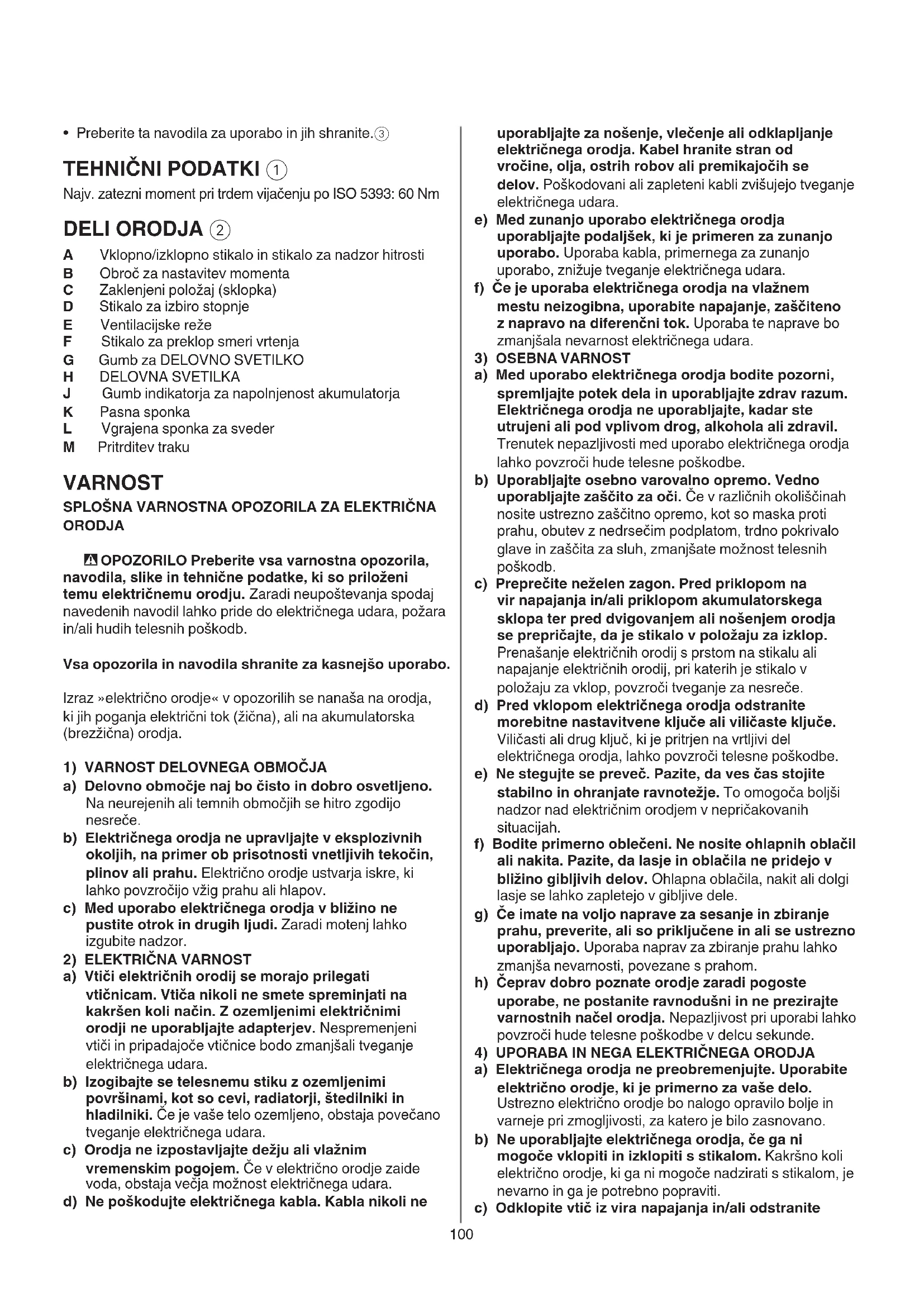 J Gumb indikatorja za napolnjenost akumulatorja K Pasna sponka L Vgrajena sponka za sveder M Pritrditev traku VARNOST SPLOŠNA VARNOSTNA OPOZORILA ZA ELEKTRIČNA ORODJA - OPOZORILO Preberite vsa varnostna opozorila, navodila, slike in tehnične podatke, ki so priloženi temu električnemu orodju. Zaradi neupoštevanja spodaj navedenih navodil lahko pride do električnega udara, požara in/ali hudih telesnih poškodb. Vsa opozorila in navodila shranite za kasnejšo uporabo. Izraz »električno orodje« v opozorilih se nanaša na orodja, ki jih poganja električni tok (žična), ali na akumulatorska (brezžična) orodja.