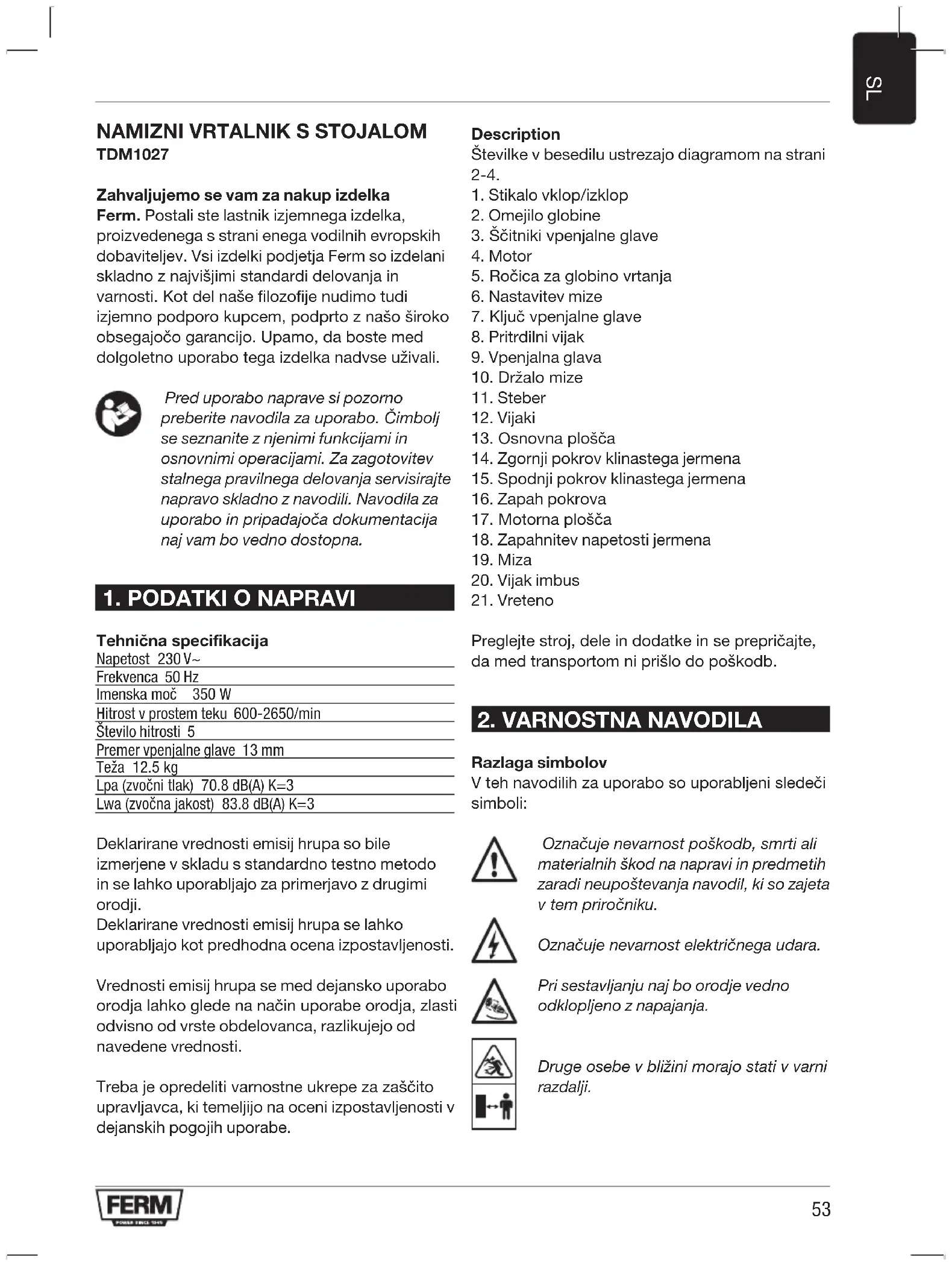 TDM1027 Zahvaljujemo se vam za nakup izdelka Ferm. Postali ste lastnik izjemnega izdelka, proizvedenega s strani enega vodilnih evropskih dobaviteljev. Vsi izdelki podjetja Ferm so izdelani skladno z najvišjimi standardi delovanja in varnosti. Kot del naše filozofije nudimo tudi izjemno podporo kupcem, podprto z našo široko obsegajočo garancijo. Upamo, da boste med dolgoletno uporabo tega izdelka nadvse uživali. Pred uporabo naprave si pozorno preberitenavodilazauporabo.Čimbolj se seznanite z njenimi funkcijami in osnovnimi operacijami. Za zagotovitev stalnega pravilnega delovanja servisirajte napravo skladno z navodili. Navodila za uporaboinpripadajočadokumentacija naj vam bo vedno dostopna.