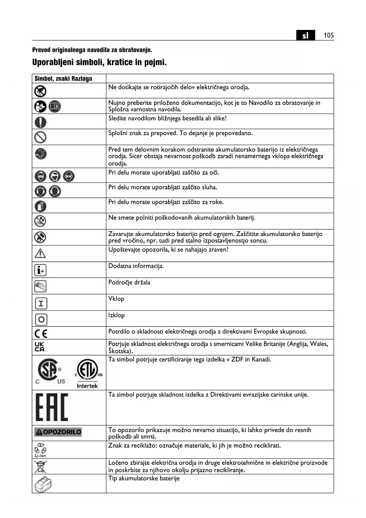 Prevod originalnega navodila za obratovanje. Uporabljeni simboli, kratice in pojmi. Simbol, znaki Razlaga Ne dotikajte se rotirajočih delov električnega orodja. Nujno preberite priloženo dokumentacijo, kot je to Navodilo za obratovanje in Splošna varnostna navodila. Sledite navodilom bližnjega besedila ali slike! Splošni znak za prepoved. To dejanje je prepovedano. Pred tem delovnim korakom odstranite akumulatorsko baterijo iz električnega orodja. Sicer obstaja nevarnost poškodb zaradi nenamernega vklopa električnega orodja. Pri delu morate uporabljati zaščito za oči. Pri delu morate uporabljati zaščito sluha. Pri delu morate uporabljati zaščito za roke. Ne smete polniti poškodovanih akumulatorskih baterij. Zavarujte akumulatorsko baterijo pred ognjem. Zaščitite akumulatorsko baterijo pred vročino, npr. tudi pred stalno izpostavljenostjo soncu. Upoštevajte opozorila, ki se nahajajo zraven! Dodatna informacija. Področje držala Vklop Izklop Potrdilo o skladnosti električnega orodja z direktivami Evropske skupnosti. Potrjuje skladnost električnega orodja s smernicami Velike Britanije (Anglija, Wales, Škotska). Ta simbol potrjuje certificiranje tega izdelka v ZDF in Kanadi. Ta simbol potrjuje skladnost izdelka z Direktivami evrazijske carinske unije. To opozorilo prikazuje možno nevarno situacijo, ki lahko privede do resnih poškodb ali smrti. Znak za reciklažo: označuje materiale, ki jih je možno reciklirati. Ločeno zbirajte električna orodja in druge elektrotehnične in električne proizvode in poskrbite za njihovo okolju prijazno recikliranje. Tip akumulatorske baterije106