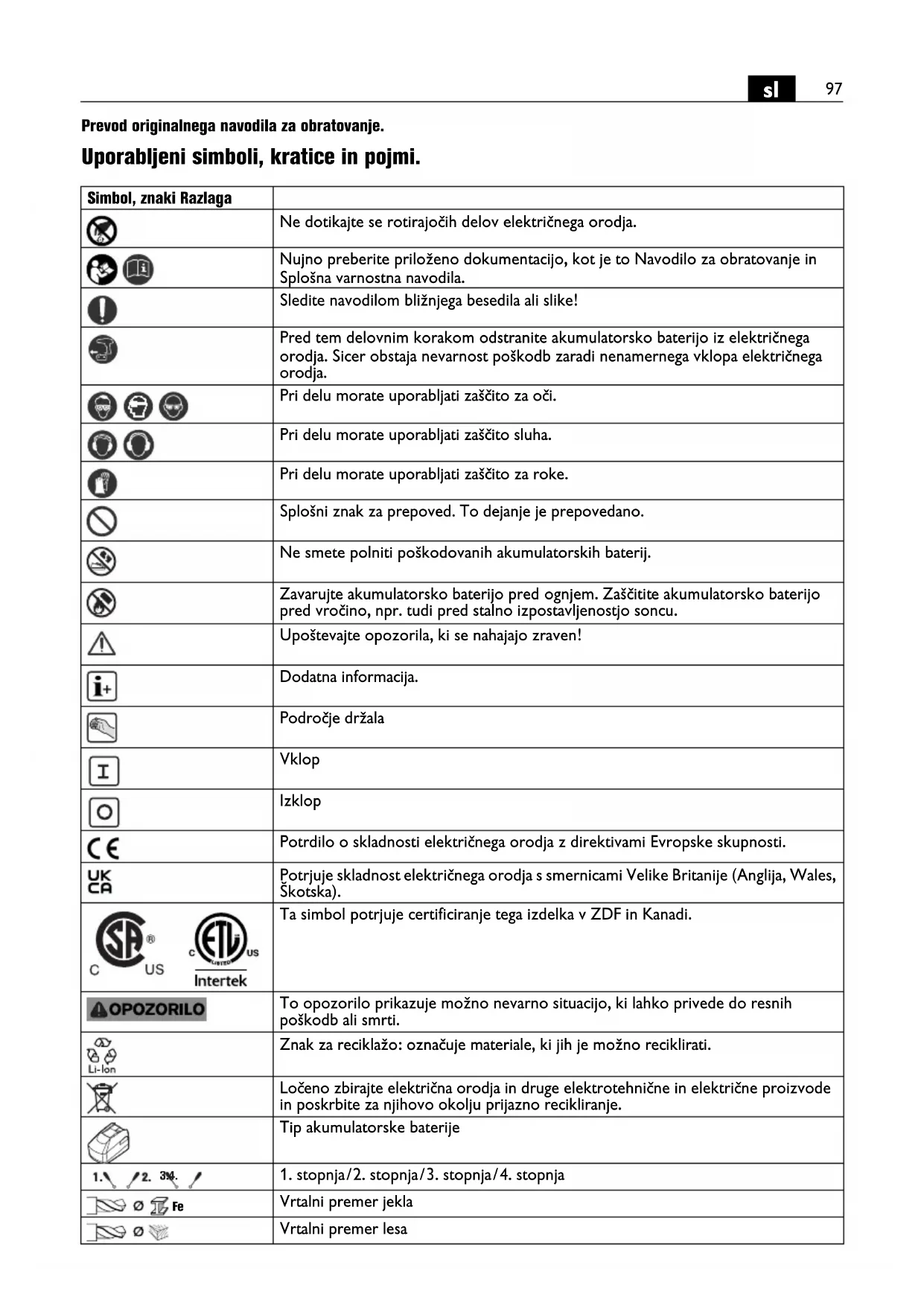 in jih v celoti razumeli. Navedeno dokumentacio shranite za kasnejso uporabo in jo izročite naprej pri posredovanju ali odsvjitvi elektricnega orodja.