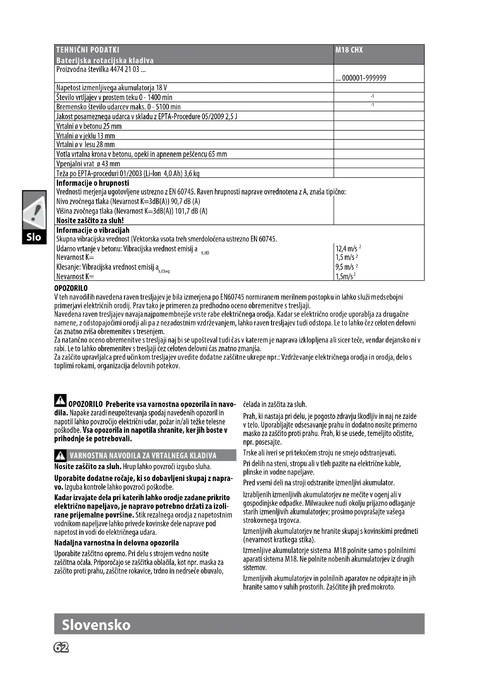 Nosite zaščito za sluh. Hrup lahko povzroči izgubo sluha. Uporabite dodatne ročaje, ki so dobavljeni skupaj z napra- vo. Izguba kontrole lahko povzroči poškodbe. Kadar izvajate dela pri katerih lahko orodje zadane prikrito električno napeljavo, je napravo potrebno držati za izoli- rane prijemalne površine. Stik rezalnega orodja z napetostnim vodnikom napeljave lahko privede kovinske dele naprave pod napetost in vodi do električnega udara. Nadaljna varnostna in delovna opozorila Uporabite zaščitno opremo. Pri delu s strojem vedno nosite zaščitna očala. Priporočajo se zaščitka oblačila, kot npr. maska za zaščito proti prahu, zaščitne rokavice, trdno in nedrseče obuvalo, čelada in zaščita za sluh. Prah, ki nastaja pri delu, je pogosto zdravju škodljiv in naj ne zaide v telo. Uporabljajte odsesavanje prahu in dodatno nosite primerno masko za zaščito proti prahu. Prah, ki se usede, temeljito očistite, npr. posesajte. Trske ali iveri se pri tekočem stroju ne smejo odstranjevati. Pri delih na steni, stropu ali v tleh pazite na električne kable, plinske in vodne napeljave. Pred vsemi deli na stroji odstranite izmenljivi akumulator. Izrabljenih izmenljivih akumulatorjev ne mečite v ogenj ali v gospodinjske odpadke. Milwaukee nudi okolju prijazno odlaganje starih izmenljivih akumulatorjev; prosimo povprašajte vašega strokovnega trgovca. Izmenljivih akumulatorjev ne hranite skupaj s kovinskimi predmeti (nevarnost kratkega stika). Izmenljive akumulatorje sistema M18 polnite samo s polnilnimi aparati sistema M18. Ne polnite nobenih akumulatorjev iz drugih sistemov. Izmenljivih akumulatorjev in polnilnih aparatov ne odpirajte in jih hranite samo v suhih prostorih. Zaščitite jih pred mokroto.63 Slo Slovensko Pod ekstremno obremenitvijo ali ob ekstremni temperaturi iz poškodovanega izmenljivega akumulatorja lahko izteka akumula- torska tekočina. Po stiku z akumulatorsko tekočino prizadeto mesto takoj izperite z vodo in milom. Po stiku z očmi takoj najmanj 10 minut dolgo temeljito izpirajte in nemudoma obiščite zdravnika. V odprtino za nameščanje izmenljivih akumulatorjev na polnilnih aparatih ne smejo zaiti nikakršni kovinski deli (nevarnost kratkega stika). OPOZORILO! V izogib, s kratkim stikom povzročene nevarnosti požara, poškodb ali okvar na proizvodu, orodja, izmenljivega akumulatorja ali polnilne naprave ne potapljajte v tekočine in poskrbite, da ne bo prihajalo do vdora tekočin v naprave in akumulatorje. Korozivne ali prevodne tekočine, kot so slana voda, določene kemikalije in belila ali proizvodi, ki le ta vsebujejo, lahko povzročijo kratek stik. Izmenljive akumulatorje sistema M18 polnite samo s polnilnimi aparati sistema M18. Ne polnite nobenih akumulatorjev iz drugih sis- temov.Izmenljivih akumulatorjev in polnilnih aparatov ne odpirajte in jih hranite samo v suhih prostorih. Zaščitite jih pred mokroto.