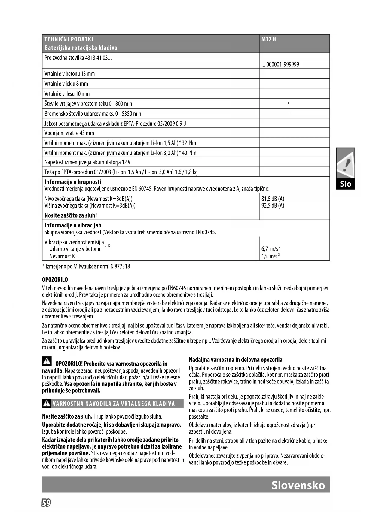 - Izmerjeno po Milwaukee normi N 877318 OPOZORILO V teh navodilih navedena raven tresljajev je bila izmerjena po EN60745 normiranem merilnem postopku in lahko služi medsebojni primerjavi električnih orodij. Prav tako je primeren za predhodno oceno obremenitve s tresljaji. Navedena raven tresljajev navaja najpomembnejše vrste rabe električnega orodja. Kadar se električno orodje uporablja za drugačne namene, z odstopajočimi orodji ali pa z nezadostnim vzdrževanjem, lahko raven tresljajev tudi odstopa. Le to lahko čez celoten delovni čas znatno zviša obremenitev s tresenjem. Za natančno oceno obremenitve s tresljaji naj bi se upošteval tudi čas v katerem je naprava izklopljena ali sicer teče, vendar dejansko ni v rabi. Le to lahko obremenitev s tresljaji čez celoten delovni čas znatno zmanjša. Za zaščito upravljalca pred učinkom tresljajev uvedite dodatne zaščitne ukrepe npr.: Vzdrževanje električnega orodja in orodja, delo s toplimi rokami, organizacija delovnih potekov.60 Slo Slovensko V primeru blokade orodja napravo takoj izklopite! Naprave ponovno ne vklapljajte dokler je orodje blokirano; pri tem bi lahko prišlo do povratnega udara z velikim reakcijskim momentom. Ugotovite in odpravite vzroke blokade orodja ob upoštevanju varnostnih navodil. Možni vzroki so lahko: