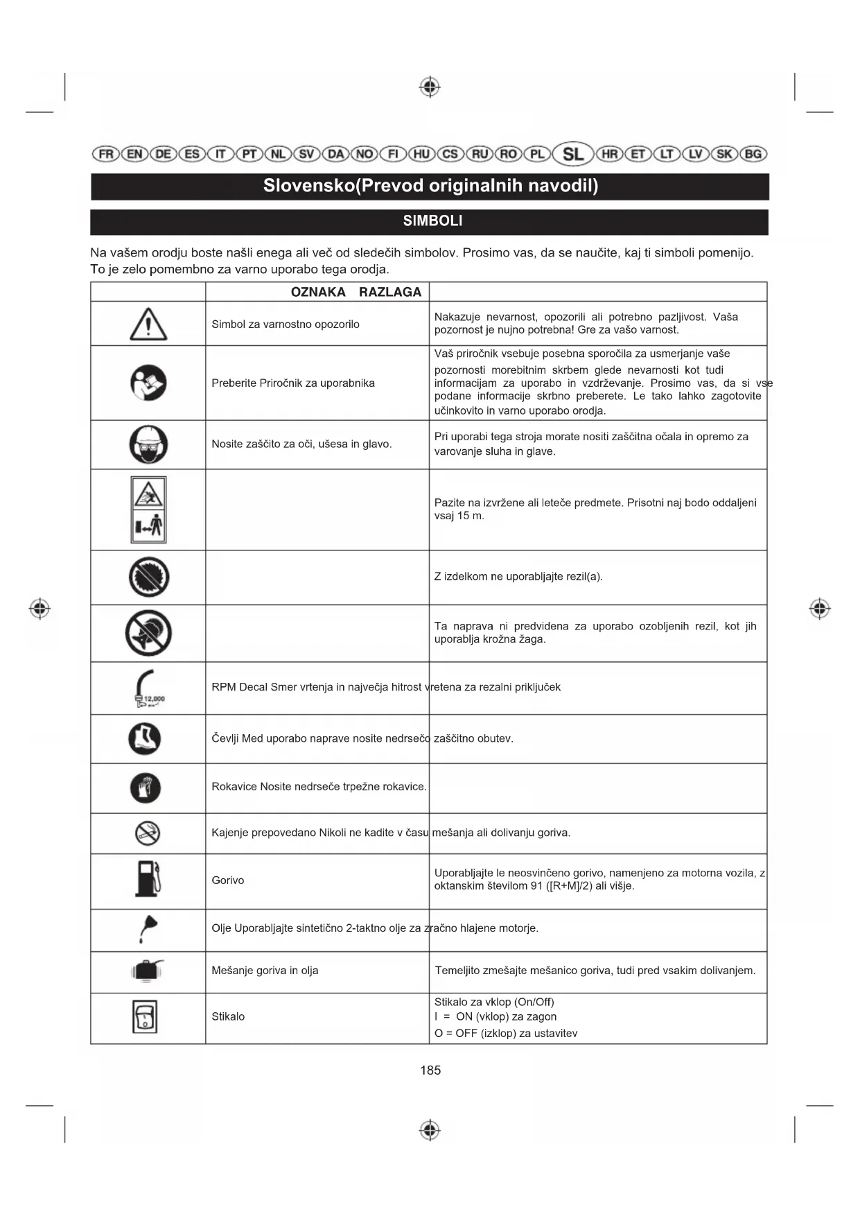 rozdziału dot. konserwacji.185 Slovensko(Prevod originalnih navodil) SIMBOLI Na vašem orodju boste našli enega ali več od sledečih simbolov. Prosimo vas, da se naučite, kaj ti simboli pomenijo. To je zelo pomembno za varno uporabo tega orodja. 2=1$.$ 5$=/$*$ Simbol za varnostno opozorilo Nakazuje nevarnost, opozorili ali potrebno pazljivost. Vaša pozornost je nujno potrebna! Gre za vašo varnost. Preberite Priročnik za uporabnika Vaš priročnik vsebuje posebna sporočila za usmerjanje vaše pozornosti morebitnim skrbem glede nevarnosti kot tudi informacijam za uporabo in vzdrževanje. Prosimo vas, da si vse podane informacije skrbno preberete. Le tako lahko zagotovite učinkovito in varno uporabo orodja. Nosite zaščito za oči, ušesa in glavo. Pri uporabi tega stroja morate nositi zaščitna očala in opremo za varovanje sluha in glave. Pazite na izvržene ali leteče predmete. Prisotni naj bodo oddaljeni vsaj 15 m. Z izdelkom ne uporabljajte rezil(a). Ta naprava ni predvidena za uporabo ozobljenih rezil, kot jih uporablja krožna žaga. RPM Decal Smer vrtenja in največja hitrost vretena za rezalni priključek Čevlji Med uporabo naprave nosite nedrsečo zaščitno obutev. Rokavice Nosite nedrseče trpežne rokavice. Kajenje prepovedano Nikoli ne kadite v času mešanja ali dolivanju goriva. Gorivo Uporabljajte le neosvinčeno gorivo, namenjeno za motorna vozila, z oktanskim številom 91 ([R+M]/2) ali višje. Olje Uporabljajte sintetično 2-taktno olje za zračno hlajene motorje. Mešanje goriva in olja Temeljito zmešajte mešanico goriva, tudi pred vsakim dolivanjem. Stikalo Stikalo za vklop (On/Off) I = ON (vklop) za zagon O = OFF (izklop) za ustavitev186 Slovensko(Prevod originalnih navodil) Položaj teka Ročico dušilne lopute premaknite v položaj »FULL« (polna zadušitev). Ročico dušilne lopute premaknite v položaj »HALF« (polovična zadušitev). Stikalo za vžig prestavite v položaj »I« (VKLOP). 10-krat pritisnite črpalni mehurček. Za zagon motorja povlecite ročaj zaganjalnika. Za zagon stisnite zaklep ročice za plin in ročico za plin. Čas čakanja 10 sekund Da bi zaustavili motor, pomaknite stikalo za vžig v položaj “O” za zaustavitev . Roke držite proč od rezil. Ustreza vsem predpisanim standardom v državi članici EU, kjer je bil kupljen izdelek. EurAsian oznaka o skladnosti. Ukrajinska oznaka za skladnost Sledeče signalne besede in pomeni naj bi pojasnili ravni tveganja, ki so povezane s tem izdelkom.
