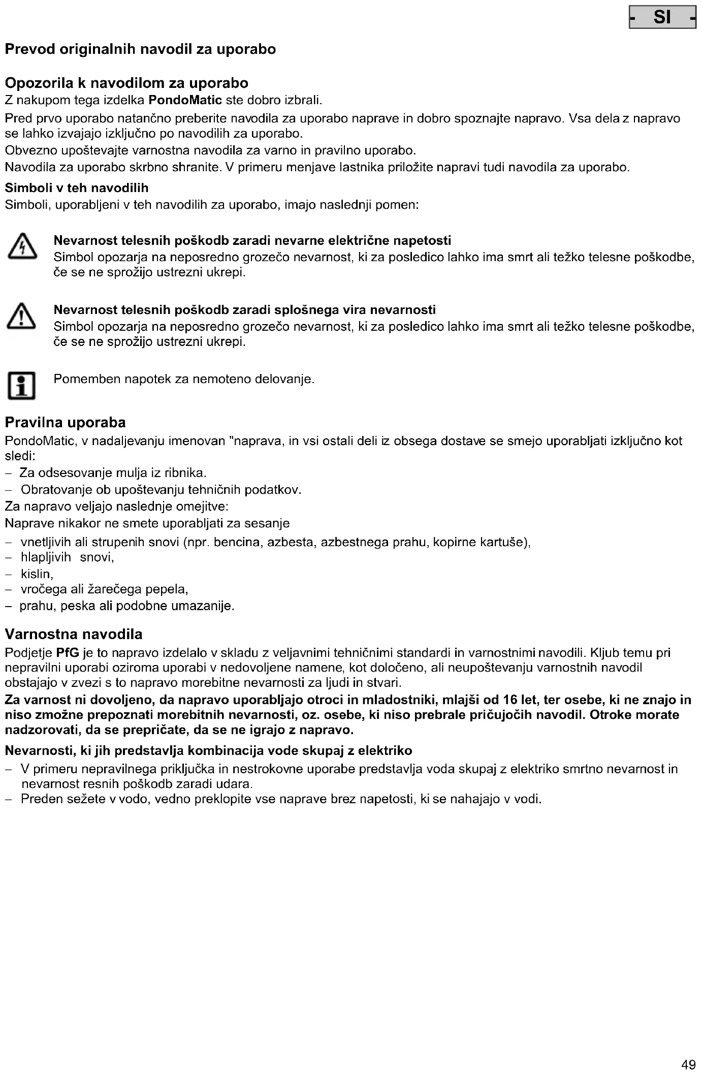 Podjetje PfG je to napravo izdelalo v skladu z veljavnimi tehnicnimi standardi in varnostnimi navodili. Kljub temu pri nepravilni uporabi oziroma uporabi v nedovoljene namene, kot doloceno, ali neupoštevanju varnostnih navodil obstajajo v zvezisi to napravo morebitne nevarnosti za ljudi in stvari.