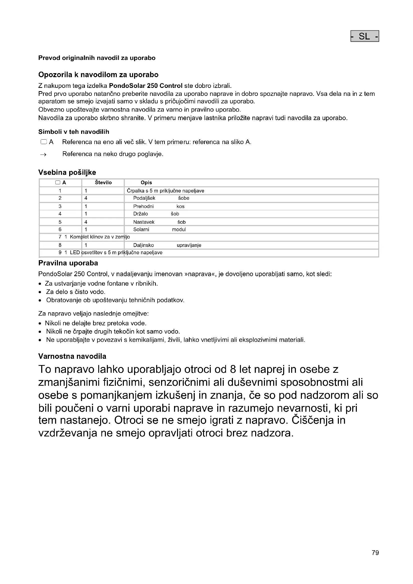 Varna uporaba Naprave ni dovoljeno prenašati ali je vleči za omrežni priključni kabel. Vode polagajte tako, da so zaščiteni pred poškodbami, poleg tega pa pazite, da nihče ne more pasti čez njih. Uporabljajte le originalne nadomestne dele in opremo. Električne naprave in instalacije z nazivno napetostjo U > 12 V AC ali U >30 V DC, ki so nameščene v vodi: Naprave in instalacije izključite iz električnega omrežja, preden sežete v vodo. Črpalko uporabljajte samo s solarnim modulom, ki ga vsebuje dobavljena pošiljka. Črpalka naj ne deluje na suho. Preprečite trde udarce in pretrese naprave. Napravo očistite vsaj 2-krat letno. Priključni vtiči naj bodo suhi.