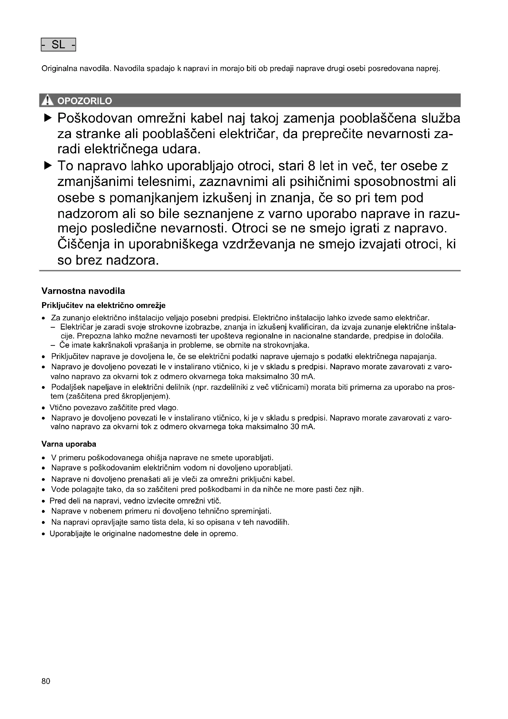 OPOZORI LO OPOZORILO Poškodovan omrežni kabel naj takoj zamenja pooblaščena služba za stranke ali pooblaščeni električar, da preprečite nevarnosti za- radi električnega udara. To napravo lahko uporabljajo otroci, stari 8 let in več, ter osebe z zmanjšanimi telesnimi, zaznavnimi ali psihičnimi sposobnostmi ali osebe s pomanjkanjem izkušenj in znanja, če so pri tem pod nadzorom ali so bile seznanjene z varno uporabo naprave in razu- mejo posledične nevarnosti. Otroci se ne smejo igrati z napravo. Čiščenja in uporabniškega vzdrževanja ne smejo izvajati otroci, ki so brez nadzora.