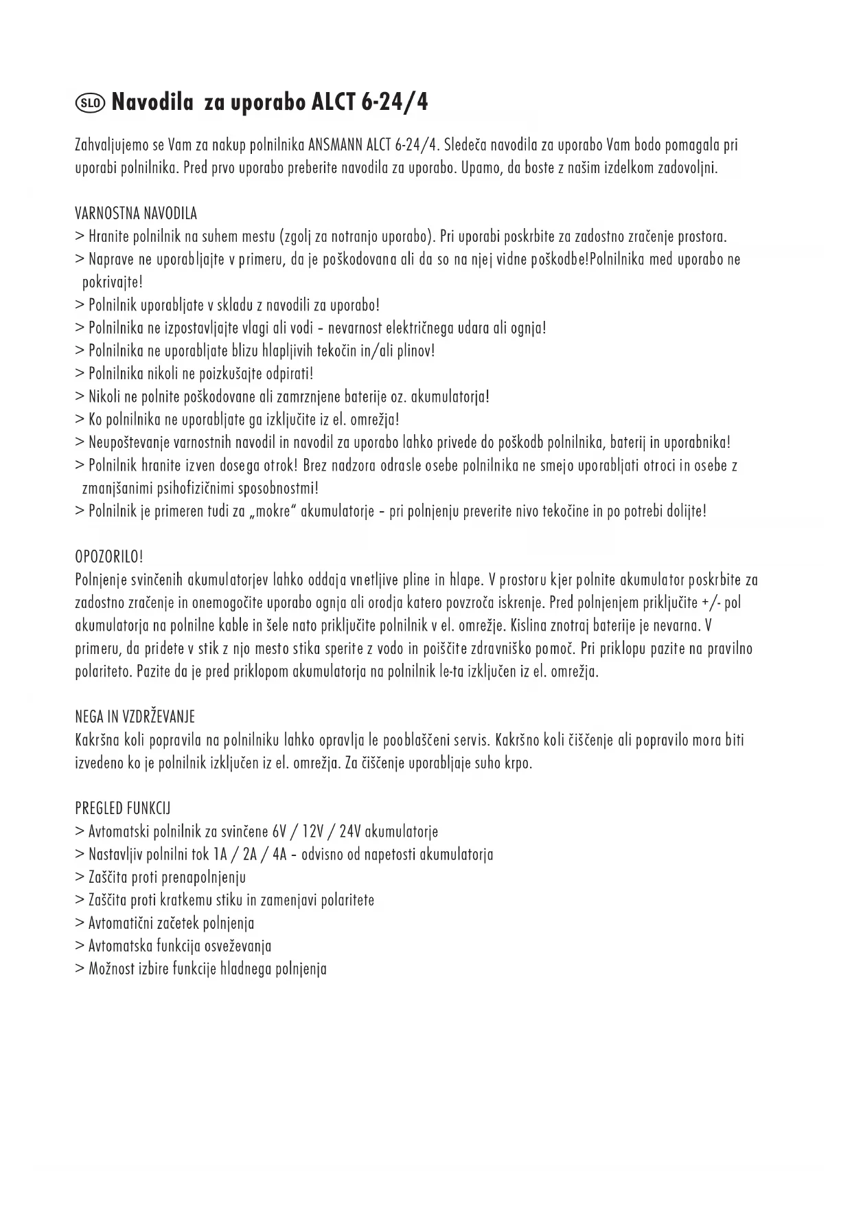 Informácie, uvedené v tomto návode na používanie sa môžu zmeniť bez predchádzajúceho upozornenia. Spoločnosť ANSMANN neručí za priame, nepriame, náhodné alebo ostané škody alebo následné škody, ktoré vznikli pri nesprávnom používaní nabíjačky alebo pri nedodržiavaní pokynov a informácií, uvedených v tomto návode na používanie. ZÁRUKA Spoločnosť ANSMANN na túto nabíjačku poskytuje záruku 3 roky. Na škody, ktoré vznikli v dôsledku nedodržania pokynov, uvedených v návode na používanie, sa záruka nevzťahuje. Technické zmeny sú vyhradené. Spoločnosť ANSMANN neručí za chyby tlače. Stav: 06/2014 Navodila za uporabo ALCT 6-24/4 Zahvaljujemo se Vam za nakup polnilnika ANSMANN ALCT 6-24/4. Sledeča navodila za uporabo Vam bodo pomagala pri uporabi polnilnika. Pred prvo uporabo preberite navodila za uporabo. Upamo, da boste z našim izdelkom zadovoljni. VARNOSTNA NAVODILA > Hranite polnilnik na suhem mestu (zgolj za notranjo uporabo). Pri uporabi poskrbite za zadostno zračenje prostora. > Naprave ne uporabljajte v primeru, da je poškodovana ali da so na njej vidne poškodbe!Polnilnika med uporabo ne pokrivajte! > Polnilnik uporabljate v skladu z navodili za uporabo! > Polnilnika ne izpostavljajte vlagi ali vodi – nevarnost električnega udara ali ognja! > Polnilnika ne uporabljate blizu hlapljivih tekočin in/ali plinov! > Polnilnika nikoli ne poizkušajte odpirati! > Nikoli ne polnite poškodovane ali zamrznjene baterije oz. akumulatorja! > Ko polnilnika ne uporabljate ga izključite iz el. omrežja! > Neupoštevanje varnostnih navodil in navodil za uporabo lahko privede do poškodb polnilnika, baterij in uporabnika! > Polnilnik hranite izven dosega otrok! Brez nadzora odrasle osebe polnilnika ne smejo uporabljati otroci in osebe z zmanjšanimi psihofizičnimi sposobnostmi! > Polnilnik je primeren tudi za „mokre“ akumulatorje – pri polnjenju preverite nivo tekočine in po potrebi dolijte! OPOZORILO! Polnjenje svinčenih akumulatorjev lahko oddaja vnetljive pline in hlape. V prostoru kjer polnite akumulator poskrbite za zadostno zračenje in onemogočite uporabo ognja ali orodja katero povzroča iskrenje. Pred polnjenjem priključite +/- pol akumulatorja na polnilne kable in šele nato priključite polnilnik v el. omrežje. Kislina znotraj baterije je nevarna. V primeru, da pridete v stik z njo mesto stika sperite z vodo in poiščite zdravniško pomoč. Pri priklopu pazite na pravilno polariteto. Pazite da je pred priklopom akumulatorja na polnilnik le-ta izključen iz el. omrežja.