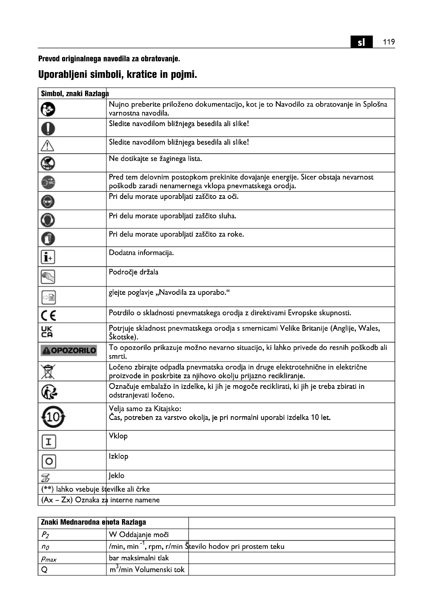 Nosite osebno zaščitno opremo ter vedno tudi zaščitna očala. Glede na vrsto in uporabo orodja s stisnjenim zrakom, se tveganje za poškodbe zmanjša z nošenjem osebne zaščitne opreme, kot so maske proti prahu, nezdrsljivih zaščitnih čevljev, zaščitne čelade ali zaščite sluha. Preprečite nenamerni zagon. Prepričajte se, da je stikalo v položaju „IZKLOP“, preden boste priključili pnevmatsko orodje na omrežje s stisnjenim zrakom. V primeru, da imate pri nošenju pnevmatskega orodja prst na stikalu ali če pnevmatsko napravo priključite na oskrbovanje s stisnjenim zrakom, ko je že priključeno, lahko to vodi do nesreč. Preden vklopite pnevmatsko orodje, odstranite vstavna orodja ali vijačne ključe. Vstavno orodje ali ključ, ki se nahaja v premikajočem delu pnevmatskega orodja, lahko vodi do poškodb. Ne precenjujte se. Poskrbite za varno stojišče in nikoli ne izgubite ravnotežja. Tako lahko pnevmatsko orodje v nepričakovanih situacijah bolje kontrolirate. Če med delom občutite mravljinčenje, odrevenelost ali bolečino, o tem obvestite svojega nadrejenega in poiščite zdravniško pomoč. Nosite primerno obleko. Ne nosite širokih oblačil ali nakita. Poskrbite za to, da bodo lasje, oblačila in rokavice vstran od premikajočih se delov. Ohlapna oblačila, nakit ali dolgi lasje se lahko zagrabijo v premikajoče se dele. Če se lahko montirajo odsesovalne in prestrezne naprave, se prepričajte, da so priključene in da se pravilno uporabljajo. Uporaba teh naprav zmanjša nevarnosti zaradi prahu. Skrbnost rokovanja in uporaba pnevmatskih orodij Ne prekoračite največjega zračnega tlaka, navedenega na orodju. Pnevmatskega orodja ne preobremenjujte. Za svoje delo uporabite pnevmatsko orodje z ustrezno namembnostjo. Z ustreznim vstavnim orodjem delate bolje in varneje v navedenem območju zmogljivosti. Ne uporabljajte pnevmatskega orodja z okvarjenim stikalom. Pnevmatsko orodje, ki ga ni več moč vklopiti ali izklopiti, je nevarno in se mora obvezno popraviti. Pnevmatsko orodje je inicialno namazano. Med prvim zagonom lahko izstopi odvečno olje in zadene upravljavca. Pred nastavitvijo pnevmatskega orodja, zamenjavo delov pribora ali preden odložite pnevmatsko orodje, morate prekiniti dovod energije. Ta previdnostni ukrep onemogoča nenameren zagon naprave. Pnevmatska orodja, ki niso v uporabi, morate hraniti izven dosega otrok. Ne dovolite, da bi pnevmatsko orodje uporabljale osebe, ki niso vešče uporabe ali ki niso prebrale teh navodil. Pnevmatska orodja so nevarna, če jih uporabljajo neizkušene osebe. Pnevmatsko orodje skrbno negujte. Kontrolirajte, ali premakljivi deli pnevmatskega orodja brezhibno delujejo in se ne zataknejo ter ali so deli zlomljeni ali poškodovani, kar bi zmanjšalo funkcijo pnevmatskega orodja. Pred uporabo pnevmatskega orodja poskrbite za to, da se poškodovani deli popravijo. Mnogo nesreč se pripeti zaradi slabo vzdrževanih pnevmatskih orodij. Poskbite za to, da bodo rezalna orodja ostra in čista. Skrbno negovana rezalna orodja z ostrimi robovi rezil se redkeje zataknejo in so lažje vodljiva. Pred začetkom dela preverite, ali je žagin list poškodovan. Uporabljajte samo nepoškodovane žagine liste. Če se žagin list zagozdi, izklopite orodje in ga držite pri miru. Poizvedujte in odpravite vzrok zagozditve. Uporabite cepilne kline. Pnevmatsko orodje, pribor, vstavna orodja itd. uporabljajte v skladu s temi navodili in tako, kot je to predpisano za ta posebni tip pnevmatskega orodja. Pri tem upoštevajte delovne pogoje in dejavnost, ki jo želite opraviti. Uporaba pnevmatskih orodij v namene, ki se razlikujejo od predvidenih, lahko privede do nevarnih situacij. Uporabljate dodatni ročaj, ki je priložen dobavi pnevmatskega orodja. Izguba kontrole nad pnevmatskim orodjem lahko vodi do poškodb. Držite pnevmatsko orodje trdno z obema rokama in poskrbite za varno stojišče. Z pnevmatskim orodjem lahko varneje delate, če ga upravljate z obema rokama. Ne obdelujte materiala, ki vsebuje azbest. Azbest je kancerogen. Prepričajte se, da je žagin list varno vpet. Držite roke vstran od žaginega lista. Ne sezite pred ali pod žagin list. Stik z žaginim listom lahko povzroči poškodbe. Žagin list lahko pri žaganju postane zelo vroč. Pnevmatsko orodje postavite na obdelovanec le takrat, ko je vklopljeno. Obstaja nevarnost povratnega udarca ali izgube kontrole nad pnevmatskim orodjem. Prepovedano je privijačenje ali kovičenje ploščic in znakov na pnevmatsko orodje. Uporabljajte lepilne ploščice. Ne uporabljajte pribora, ki ga proizvajalec pnevmatskega orodja ni razvil ali sprostil. Varno obratovanje ni možno zagotoviti le s tem, da je pribor primeren za pnevmatsko orodje. Pazite na skrite električne vodnike, plinski in vodovodni cevovod. Pred pričetkom dela kontrolirajte delovno območje, npr. z lokatorjem kovine. Servis Vašo pnevmatsko napravo naj popravljajo samo kvalificirani strokovnjaki ob uporabi originalnih nadomestnih delov. S tem boste zagotovili varnost pnevmatskega orodja.122