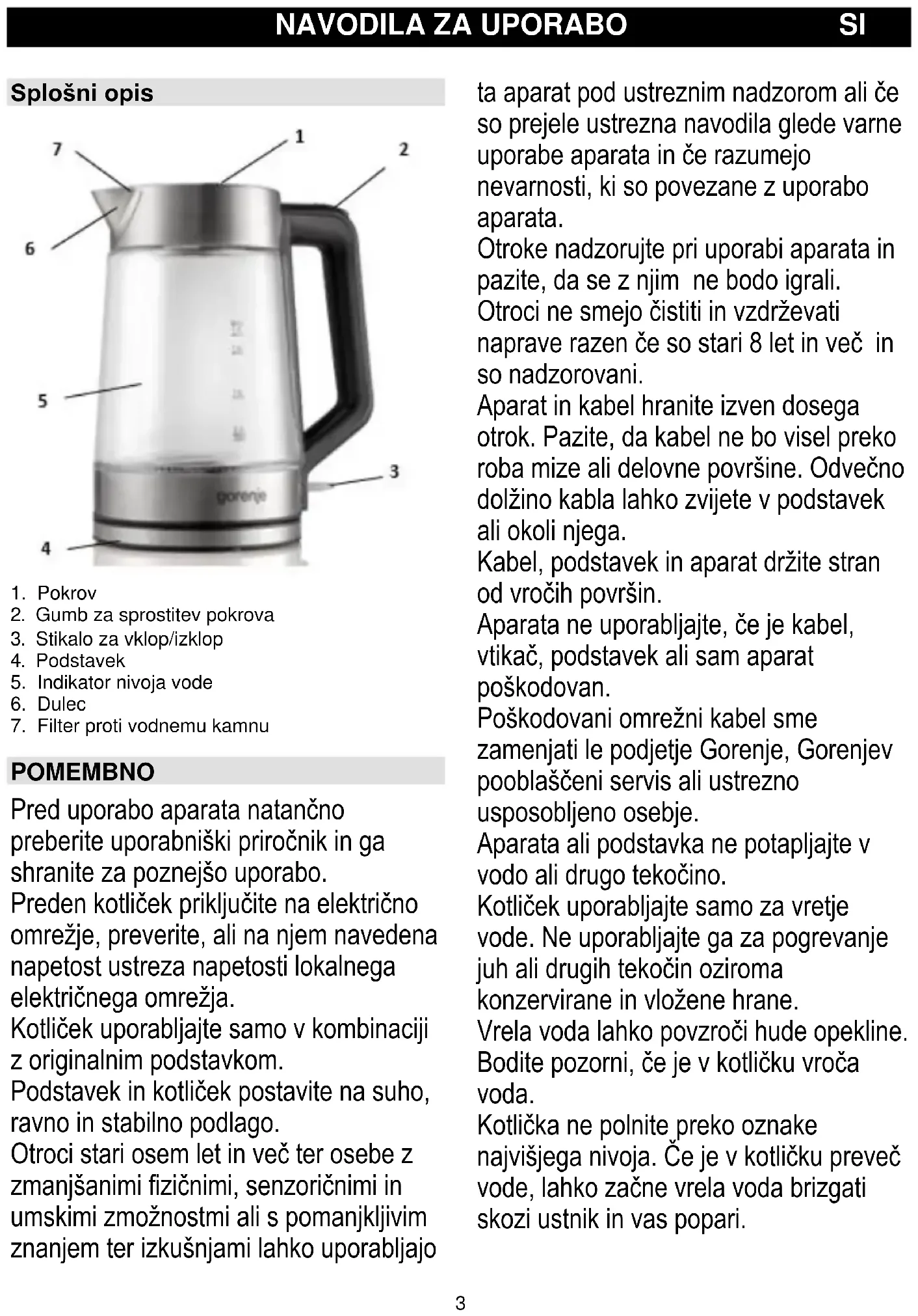 POMEMBNO Pred uporabo aparata natančno preberite uporabniški priročnik in ga shranite za poznejšo uporabo. Preden kotliček priključite na električno omrežje, preverite, ali na njem navedena napetost ustreza napetosti lokalnega električnega omrežja. Kotliček uporabljajte samo v kombinaciji z originalnim podstavkom. Podstavek in kotliček postavite na suho, ravno in stabilno podlago. Otroci stari osem let in več ter osebe z zmanjšanimi fizičnimi, senzoričnimi in umskimi zmožnostmi ali s pomanjkljivim znanjem ter izkušnjami lahko uporabljajo ta aparat pod ustreznim nadzorom ali če so prejele ustrezna navodila glede varne uporabe aparata in če razumejo nevarnosti, ki so povezane z uporabo aparata. Otroke nadzorujte pri uporabi aparata in pazite, da se z njim ne bodo igrali. Otroci ne smejo čistiti in vzdrževati naprave razen če so stari 8 let in več in so nadzorovani. Aparat in kabel hranite izven dosega otrok. Pazite, da kabel ne bo visel preko roba mize ali delovne površine. Odvečno dolžino kabla lahko zvijete v podstavek ali okoli njega. Kabel, podstavek in aparat držite stran od vročih površin. Aparata ne uporabljajte, če je kabel, vtikač, podstavek ali sam aparat poškodovan. Poškodovani omrežni kabel sme zamenjati le podjetje Gorenje, Gorenjev pooblaščeni servis ali ustrezno usposobljeno osebje. Aparata ali podstavka ne potapljajte v vodo ali drugo tekočino. Kotliček uporabljajte samo za vretje vode. Ne uporabljajte ga za pogrevanje juh ali drugih tekočin oziroma konzervirane in vložene hrane. Vrela voda lahko povzroči hude opekline. Bodite pozorni, če je v kotličku vroča voda. Kotlička ne polnite preko oznake najvišjega nivoja. Če je v kotličku preveč vode, lahko začne vrela voda brizgati skozi ustnik in vas popari.4 Ne odpirajte pokrova, ko voda vre. Bodite previdni, ko odpirate pokrov takoj po zavretju vode: para iz kotlička je zelo vroča. Ne dotikajte se ohišja kotlička, ker se med uporabo močno segreje. Kotliček dvignite za ročaj. Voda mora prekrivati vsaj dno kotlička, sicer lahko izhlapi in izsuši kotliček. Na podstavku kotlička se lahko pojavi nekaj kondenza. To je povsem običajno in ne pomeni nobene napake v delovanju. Ko uporabljate kotliček, se lahko glede na trdoto vode v lokalnem vodovodnem sistemu na grelnem elementu kotlička pojavljajo manjše lise. To je posledica vodnega kamna, ki se postopoma kopiči na grelnem elementu in v notranjosti kotlička. Trša je voda, hitreje se kopiči vodni kamen. Vodni kamen je lahko različnih barv. Čeprav je neškodljiv, lahko prevelika količina vodnega kamna vpliva na delovanje kotlička. Zato redno odstranjujte vodni kamen, kot je opisano v poglavju “Odstranjevanje vodnega kamna”.