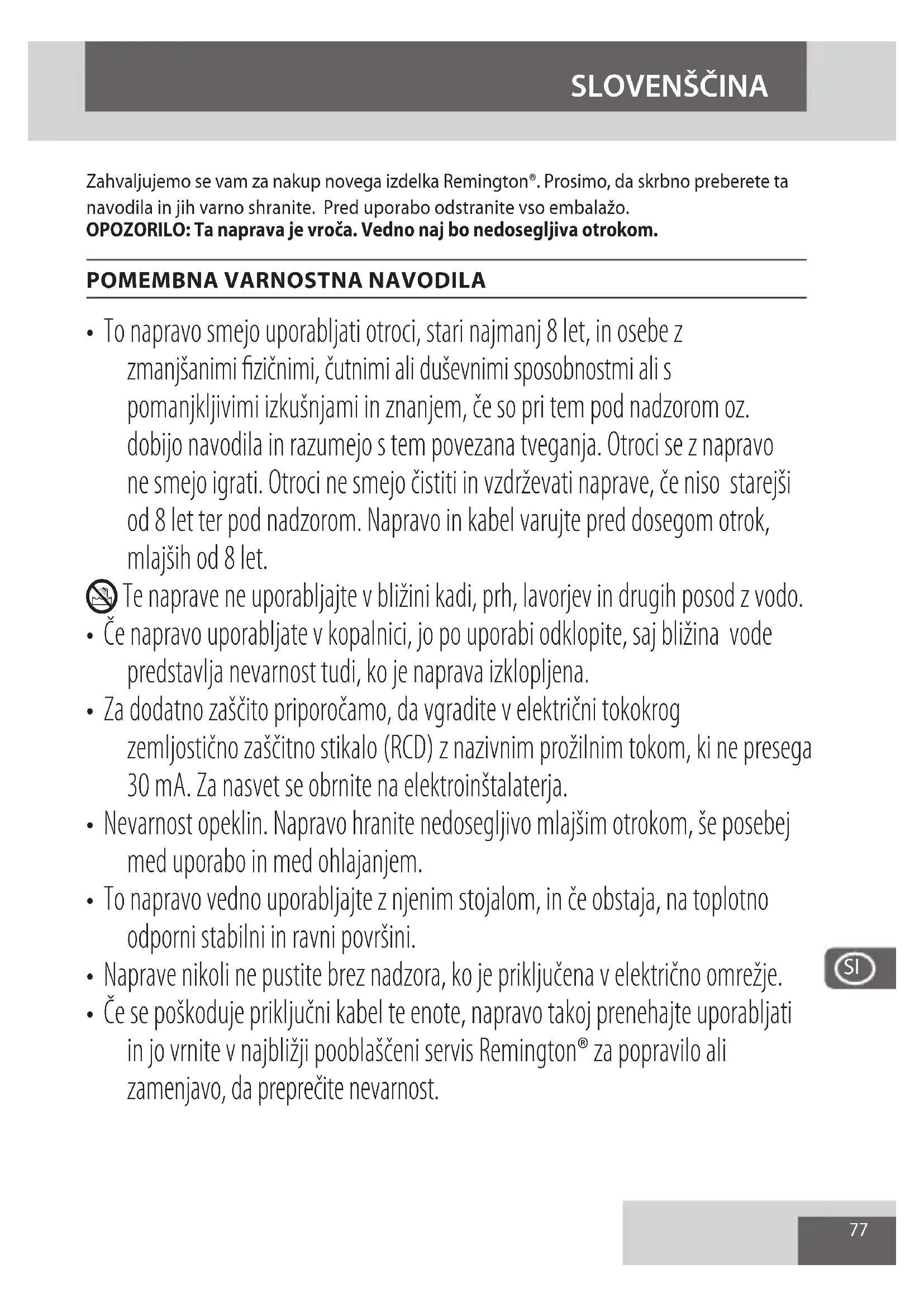 - Če se poškoduje priključni kabel te enote, napravo takoj prenehajte uporabljati in jo vrnite v najbližji pooblaščeni servis Remington® za popravilo ali zamenjavo, da preprečite nevarnost. SLOVENŠČINA