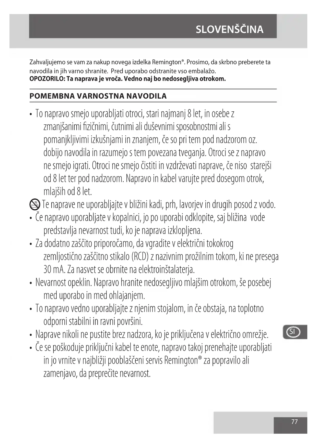 - Če se poškoduje priključni kabel te enote, napravo takoj prenehajte uporabljati in jo vrnite v najbližji pooblaščeni servis Remington® za popravilo ali zamenjavo, da preprečite nevarnost. SLOVENŠČINA