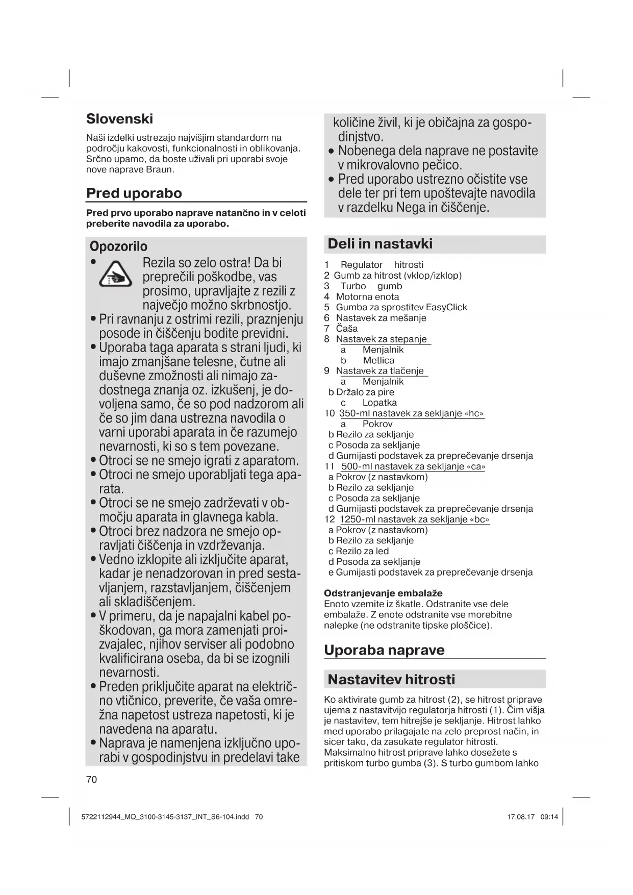 Pred uporabo ustrezno očistite vse dele ter pri tem upoštevajte navodila v razdelku Nega in čiščenje. Deli in nastavki 1 Regulator hitrosti 2 Gumb za hitrost (vklop/izklop) 3 Turbo gumb 4 Motorna enota 5 Gumba za sprostitev EasyClick 6 Nastavek za mešanje 7 Čaša 8 Nastavek za stepanje a Menjalnik b Metlica 9 Nastavek za tlačenje a Menjalnik b Držalo za pire c Lopatka 10 350-ml nastavek za sekljanje «hc» a Pokrov b Rezilo za sekljanje c Posoda za sekljanje d Gumijasti podstavek za preprečevanje drsenja 11 500-ml nastavek za sekljanje «ca» a Pokrov (z nastavkom) b Rezilo za sekljanje c Posoda za sekljanje d Gumijasti podstavek za preprečevanje drsenja 12 1250-ml nastavek za sekljanje «bc» a Pokrov (z nastavkom) b Rezilo za sekljanje c Rezilo za led d Posoda za sekljanje e Gumijasti podstavek za preprečevanje drsenja Odstranjevanje embalaže Enoto vzemite iz škatle. Odstranite vse dele embalaže. Z enote odstranite vse morebitne nalepke (ne odstranite tipske ploščice). Uporaba naprave Nastavitev hitrosti Ko aktivirate gumb za hitrost (2), se hitrost priprave ujema z nastavitvijo regulatorja hitrosti (1). Čim višja je nastavitev, tem hitrejše je sekljanje. Hitrost lahko med uporabo prilagajate na zelo preprost način, in sicer tako, da zasukate regulator hitrosti. Maksimalno hitrost priprave lahko dosežete s pritiskom turbo gumba (3). S turbo gumbom lahko 5722112944_MQ_3100-3145-3137_INT_S6-104.indd 705722112944_MQ_3100-3145-3137_INT_S6-104.indd 70 17.08.17 09:1417.08.17 09:1471 sprožite tudi zmogljive takojšnje impulze, za katere vam ni treba uporabiti regulatorja hitrosti. Mešalna gred (A) Ročni mešalnik je popolnoma primeren tudi za pripravo omak, solatnih prelivov, juh, hrane za dojenčke kot tudi za pijače, smutije in mlečne napitke. Če želite doseči najboljše rezultate, uporabite turbo hitrost. Sestava in delovanje