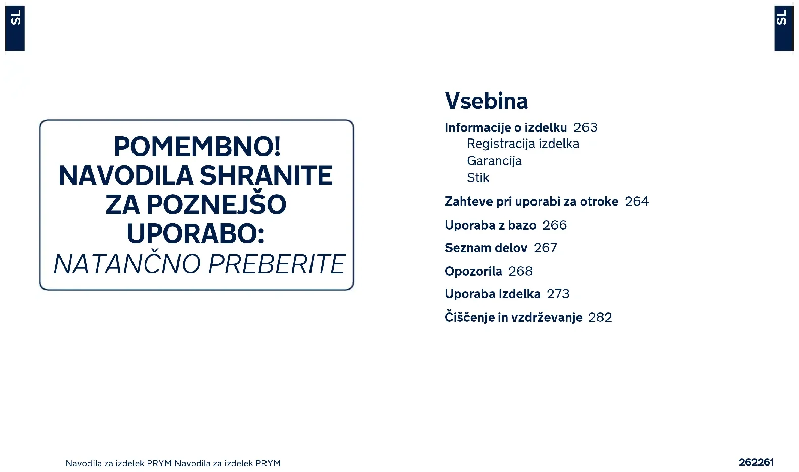 Vsebina Informacije o izdelku 263 Registracija izdelka Garancija Stik Zahteve pri uporabi za otroke 264 Uporaba z bazo 266 Seznam delov 267 Opozorila 268 Uporaba izdelka 273 Čiščenje in vzdrževanje 282264263 Navodila za izdelek PRYM Navodila za izdelek PRYM