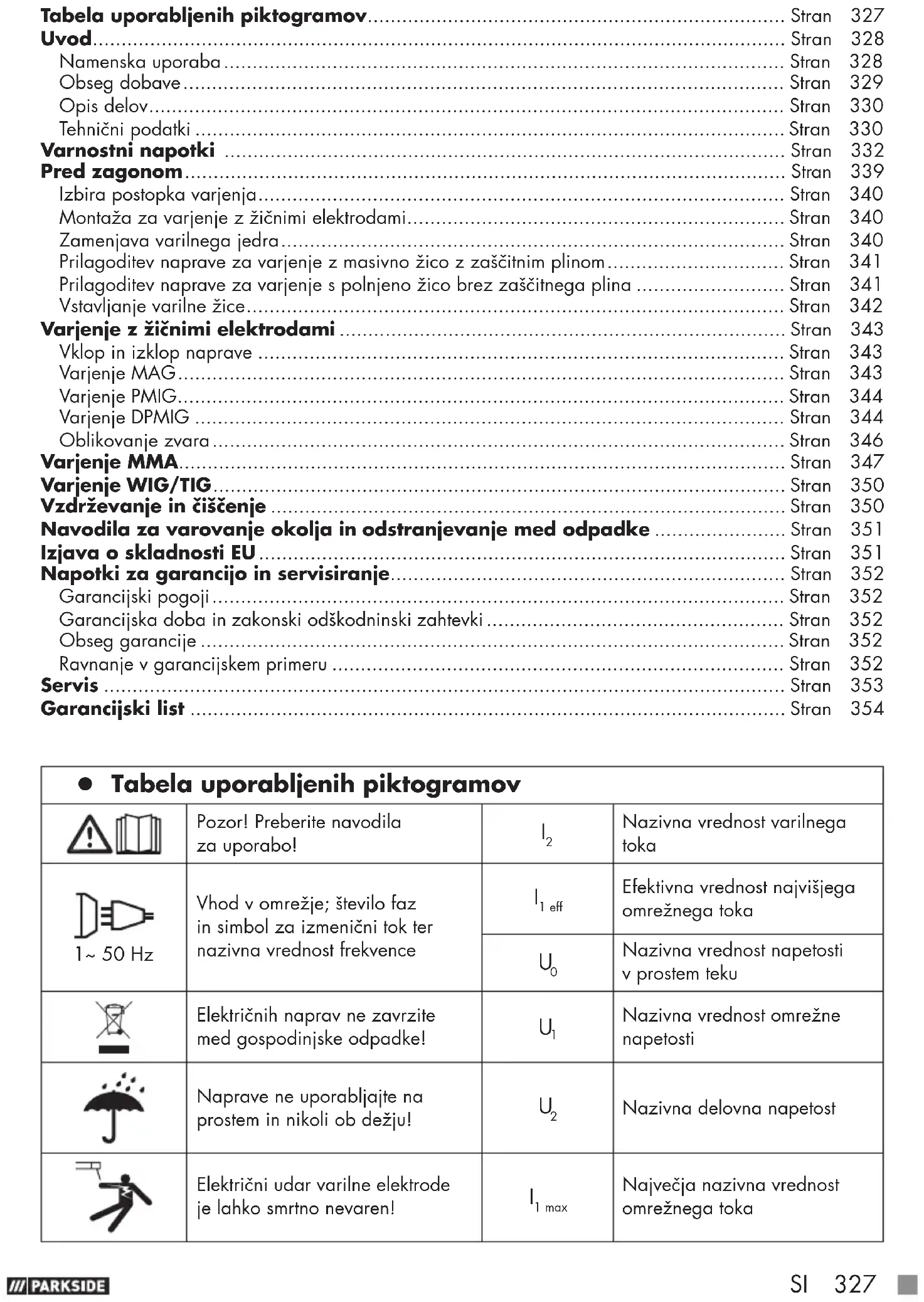 Vdihovanje varilnih dimov lahko ogrozi vaše zdravje. Previdno! Nevarnost električnega udara! Varilne iskre lahko povzročijo eksplozijo ali požar. Pomemben napotek! Žarki obloka lahko škodijo očem in poškodujejo kožo. Embalažo in napravo odstranite na okolju prijazen način!
