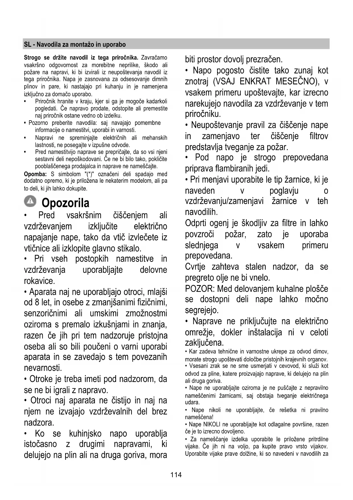 - Neupoštevanje pravil za čiščenje nape in zamenjavo ter čiščenje filtrov predstavlja tveganje za požar.