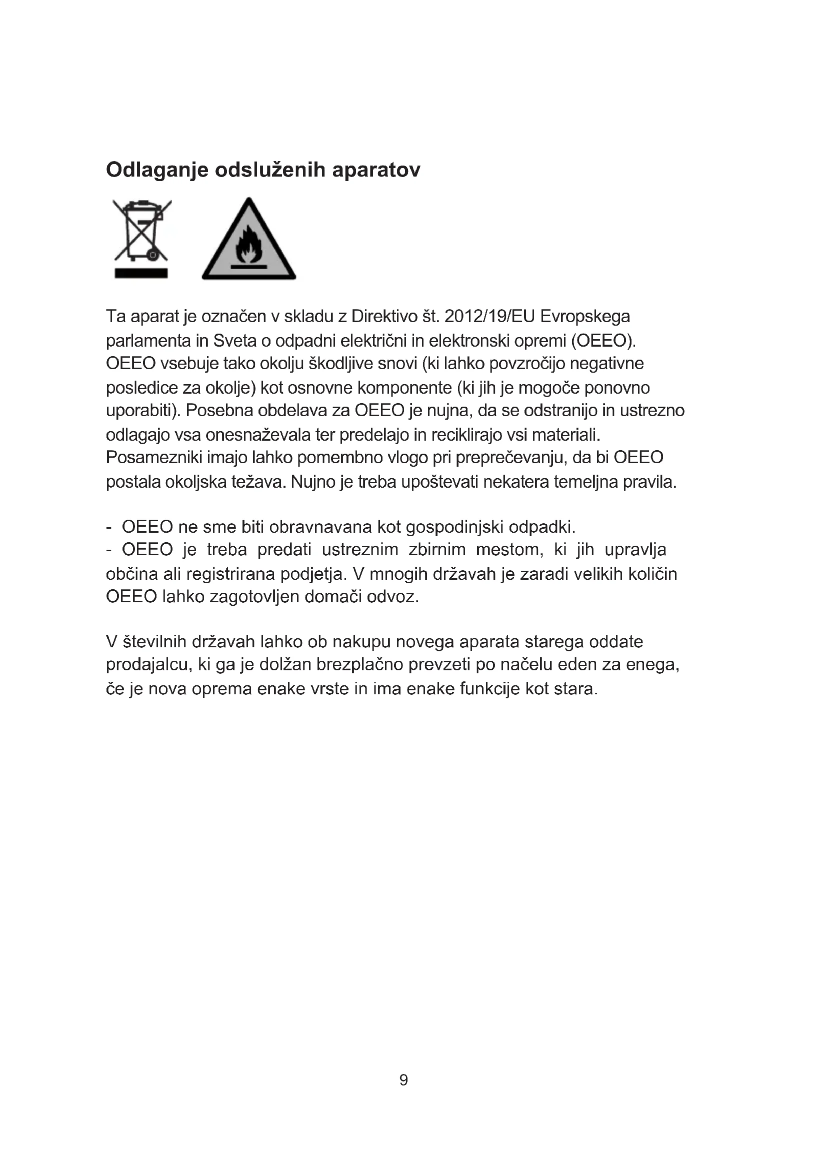 Ta aparat je označen v skladu z Direktivo št. 2012/19/EU Evropskega parlamenta in Sveta o odpadni električni in elektronski opremi (OEEO). OEEO vsebuje tako okolju škodljive snovi (ki lahko povzročijo negativne posledice za okolje) kot osnovne komponente (ki jih je mogoče ponovno uporabiti). Posebna obdelava za OEEO je nujna, da se odstranijo in ustrezno odlagajo vsa onesnaževala ter predelajo in reciklirajo vsi materiali. Posamezniki imajo lahko pomembno vlogo pri preprečevanju, da bi OEEO postala okoljska težava. Nujno je treba upoštevati nekatera temeljna pravila. - OEEO ne sme biti obravnavana kot gospodinjski odpadki. - OEEO je treba predati ustreznim zbirnim mestom, ki jih upravlja občina ali registrirana podjetja. V mnogih državah je zaradi velikih količin OEEO lahko zagotovljen domači odvoz. V številnih državah lahko ob nakupu novega aparata starega oddate prodajalcu, ki ga je dolžan brezplačno prevzeti po načelu eden za enega, če je nova oprema enake vrste in ima enake funkcije kot stara.