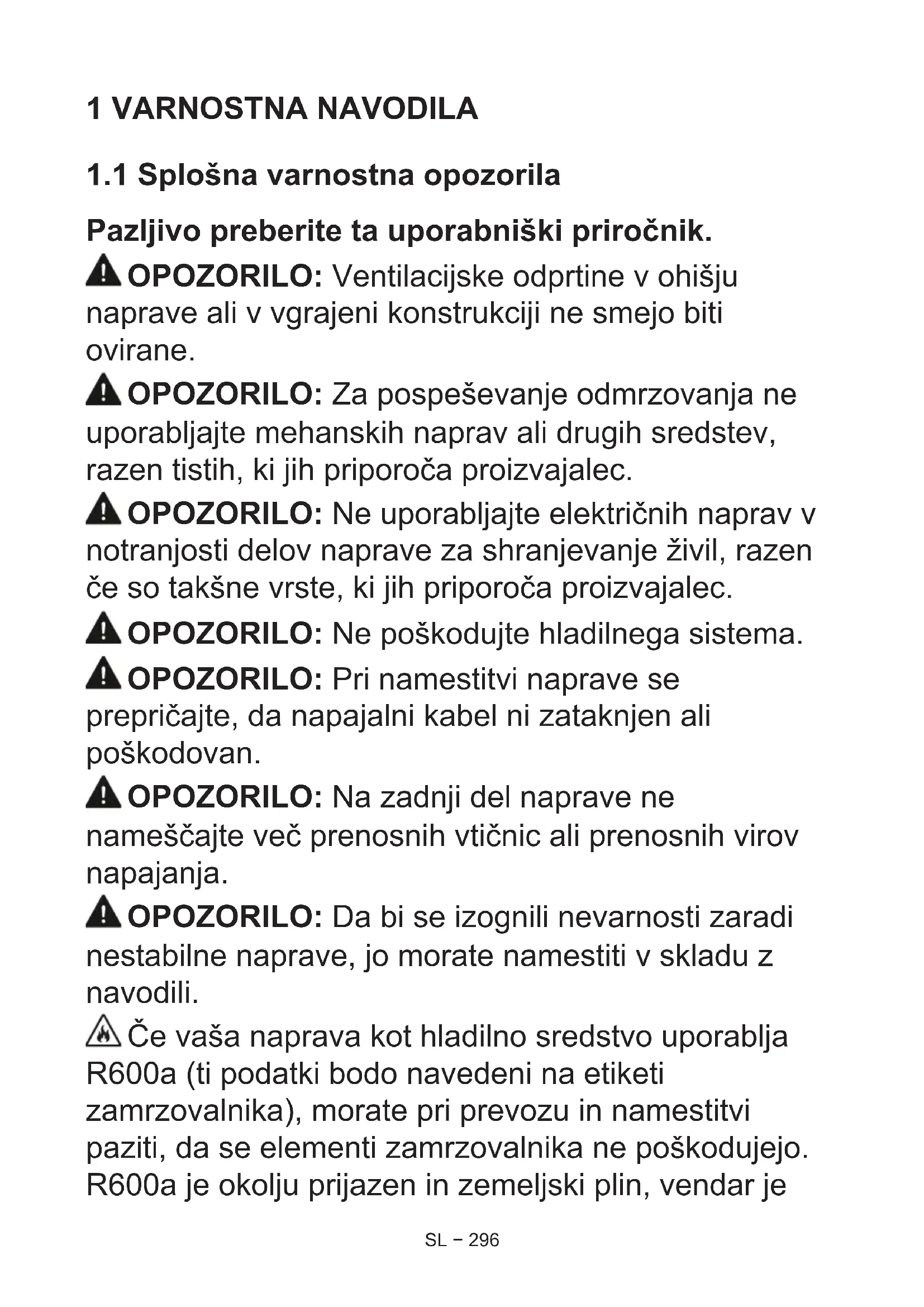 Pazljivo preberite ta uporabniški priročnik. OPOZORILO: Ventilacijske odprtine v ohišju naprave ali v vgrajeni konstrukciji ne smejo biti ovirane. OPOZORILO: Za pospeševanje odmrzovanja ne uporabljajte mehanskih naprav ali drugih sredstev, razen tistih, ki jih priporoča proizvajalec. OPOZORILO: Ne uporabljajte električnih naprav v notranjosti delov naprave za shranjevanje živil, razen če so takšne vrste, ki jih priporoča proizvajalec. OPOZORILO: Ne poškodujte hladilnega sistema. OPOZORILO: Pri namestitvi naprave se prepričajte, da napajalni kabel ni zataknjen ali poškodovan. OPOZORILO: Na zadnji del naprave ne nameščajte več prenosnih vtičnic ali prenosnih virov napajanja. OPOZORILO: Da bi se izognili nevarnosti zaradi nestabilne naprave, jo morate namestiti v skladu z navodili. Če vaša naprava kot hladilno sredstvo uporablja R600a (ti podatki bodo navedeni na etiketi zamrzovalnika), morate pri prevozu in namestitvi paziti, da se elementi zamrzovalnika ne poškodujejo. R600a je okolju prijazen in zemeljski plin, vendar jeSL − 297 eksploziven. Če pride do puščanja zaradi poškodb hladnejših elementov, hladilnik odmaknite od odprtega ognja ali toplotnih virov in nekaj minut prezračite sobo, v kateri je aparat.