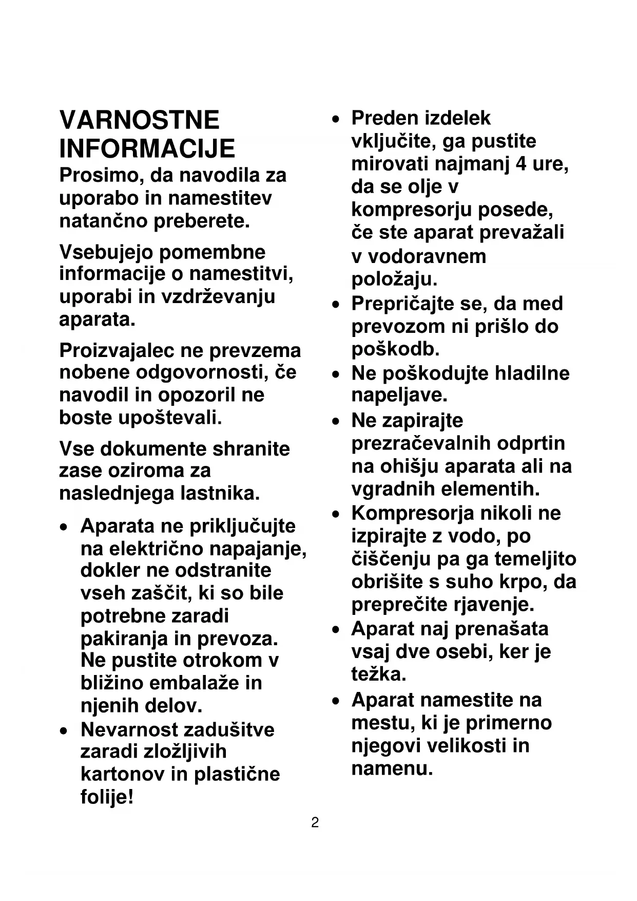 VARNOSTNE INFORMACIJE Prosimo, da navodila za uporabo in namestitev natančno preberete. Vsebujejo pomembne informacije o namestitvi, uporabi in vzdrževanju aparata. Proizvajalec ne prevzema nobene odgovornosti, če navodil in opozoril ne boste upoštevali. Vse dokumente shranite zase oziroma za naslednjega lastnika.