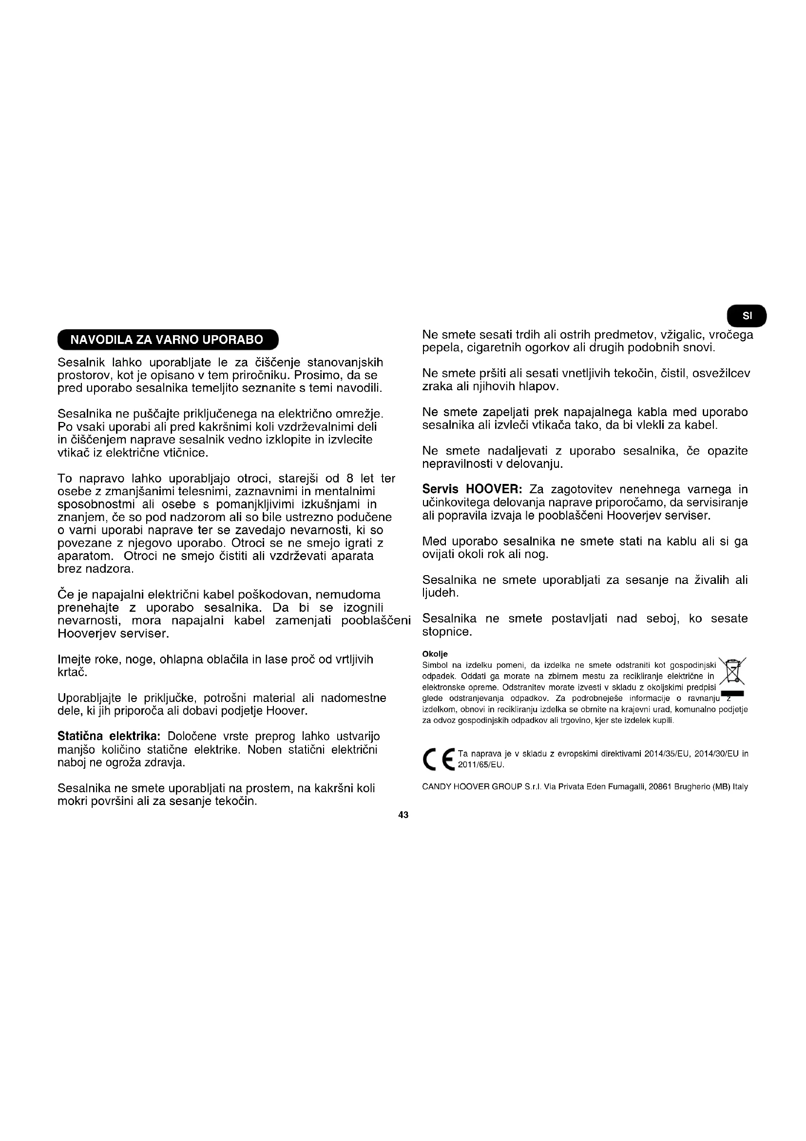 Sesalnik lahko uporabljate le za čiščenje stanovanjskih prostorov, kot je opisano v tem priročniku. Prosimo, da se pred uporabo sesalnika temeljito seznanite s temi navodili. Sesalnika ne puščajte priključenega na električno omrežje. Po vsaki uporabi ali pred kakršnimi koli vzdrževalnimi deli in čiščenjem naprave sesalnik vedno izklopite in izvlecite vtikač iz električne vtičnice. To napravo lahko uporabljajo otroci, starejši od 8 let ter osebe z zmanjšanimi telesnimi, zaznavnimi in mentalnimi sposobnostmi ali osebe s pomanjkljivimi izkušnjami in znanjem, če so pod nadzorom ali so bile ustrezno podučene o varni uporabi naprave ter se zavedajo nevarnosti, ki so povezane z njegovo uporabo. Otroci se ne smejo igrati z aparatom. Otroci ne smejo čistiti ali vzdrževati aparata brez nadzora. Če je napajalni električni kabel poškodovan, nemudoma prenehajte z uporabo sesalnika. Da bi se izognili nevarnosti, mora napajalni kabel zamenjati pooblaščeni Hooverjev serviser. Imejte roke, noge, ohlapna oblačila in lase proč od vrtljivih krtač. Uporabljajte le priključke, potrošni material ali nadomestne dele, ki jih priporoča ali dobavi podjetje Hoover. Statična elektrika: Določene vrste preprog lahko ustvarijo manjšo količino statične elektrike. Noben statični električni naboj ne ogroža zdravja. Sesalnika ne smete uporabljati na prostem, na kakršni koli mokri površini ali za sesanje tekočin. Ne smete sesati trdih ali ostrih predmetov, vžigalic, vročega pepela, cigaretnih ogorkov ali drugih podobnih snovi. Ne smete pršiti ali sesati vnetljivih tekočin, čistil, osvežilcev zraka ali njihovih hlapov. Ne smete zapeljati prek napajalnega kabla med uporabo sesalnika ali izvleči vtikača tako, da bi vlekli za kabel. Ne smete nadaljevati z uporabo sesalnika, če opazite nepravilnosti v delovanju. Servis HOOVER: Za zagotovitev nenehnega varnega in učinkovitega delovanja naprave priporočamo, da servisiranje ali popravila izvaja le pooblaščeni Hooverjev serviser. Med uporabo sesalnika ne smete stati na kablu ali si ga ovijati okoli rok ali nog. Sesalnika ne smete uporabljati za sesanje na živalih ali ljudeh. Sesalnika ne smete postavljati nad seboj, ko sesate stopnice. Okolje Simbol na izdelku pomeni, da izdelka ne smete odstraniti kot gospodinjski odpadek. Oddati ga morate na zbirnem mestu za recikliranje električne in elektronske opreme. Odstranitev morate izvesti v skladu z okoljskimi predpisi glede odstranjevanja odpadkov. Za podrobneješe informacije o ravnanju z izdelkom, obnovi in recikliranju izdelka se obrnite na krajevni urad, komunalno podjetje za odvoz gospodinjskih odpadkov ali trgovino, kjer ste izdelek kupili. Ta naprava je v skladu z evropskimi direktivami 2014/35/EU, 2014/30/EU in 2011/65/EU. CANDY HOOVER GROUP S.r.l. Via Privata Eden Fumagalli, 20861 Brugherio (MB) Italy SI44