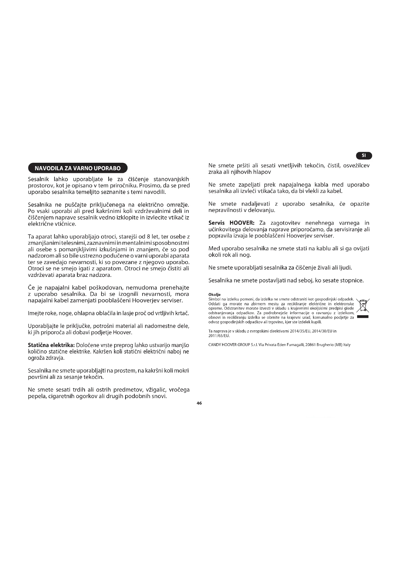 Sesalnik lahko uporabljate le za čiščenje stanovanjskih prostorov, kot je opisano v tem priročniku. Prosimo, da se pred uporabo sesalnika temeljito seznanite s temi navodili. Sesalnika ne puščajte priključenega na električno omrežje. Po vsaki uporabi ali pred kakršnimi koli vzdrževalnimi deli in čiščenjem naprave sesalnik vedno izklopite in izvlecite vtikač iz električne vtičnice. Ta aparat lahko uporabljajo otroci, starejši od 8 let, ter osebe z zmanjšanimi telesnimi, zaznavnimi in mentalnimi sposobnostmi ali osebe s pomanjkljivimi izkušnjami in znanjem, če so pod nadzorom ali so bile ustrezno podučene o varni uporabi aparata ter se zavedajo nevarnosti, ki so povezane z njegovo uporabo. Otroci se ne smejo igati z aparatom. Otroci ne smejo čistiti ali vzdrževati aparata braz nadzora. Če je napajalni kabel poškodovan, nemudoma prenehajte z uporabo sesalnika. Da bi se izognili nevarnosti, mora napajalni kabel zamenjati pooblaščeni Hooverjev serviser. Imejte roke, noge, ohlapna oblačila in lasje proč od vrtljivih krtač. Uporabljajte le priključke, potrošni material ali nadomestne dele, ki jih priporoča ali dobavi podjetje Hoover. Statična elektrika: Določene vrste preprog lahko ustvarijo manjšo količino statične elektrike. Kakršen koli statični električni naboj ne ogroža zdravja. Sesalnika ne smete uporabljajti na prostem, na kakršni koli mokri površini ali za sesanje tekočin. Ne smete sesati trdih ali ostrih predmetov, vžigalic, vročega pepela, cigaretnih ogorkov ali drugih podobnih snovi. Ne smete pršiti ali sesati vnetljivih tekočin, čistil, osvežilcev zraka ali njihovih hlapov Ne smete zapeljati prek napajalnega kabla med uporabo sesalnika ali izvleči vtikača tako, da bi vlekli za kabel. Ne smete nadaljevati z uporabo sesalnika, če opazite nepravilnosti v delovanju. Servis HOOVER: Za zagotovitev nenehnega varnega in učinkovitega delovanja naprave priporočamo, da servisiranje ali popravila izvaja le pooblaščeni Hooverjev serviser. Med uporabo sesalnika ne smete stati na kablu ali si ga ovijati okoli rok ali nog. Ne smete uporabljati sesalnika za čiščenje živali ali ljudi. Sesalnika ne smete postavljati nad seboj, ko sesate stopnice. Okolje Simbol na izdelku pomeni, da izdelka ne smete odstraniti kot gospodinjski odpadek. Oddati ga morate na zbirnem mestu za recikliranje električne in elektronske opreme. Odstranitev morate izvesti v skladu s krajevnimi okoljskimi predpisi glede odstranjevanja odpadkov. Za podrobneješe informacije o ravnanju z izdelkom, obnovi in recikliranju izdelka se obrnite na krajevni urad, komunalno podjetje za odvoz gospodinjskih odpadkov ali trgovino, kjer ste izdelek kupili. Ta naprava je v skladu z evropskimi direktivami 2014/35/EU, 2014/30/EU in 2011/65/EU. CANDY HOOVER GROUP S.r.l. Via Privata Eden Fumagalli, 20861 Brugherio (MB) Italy47