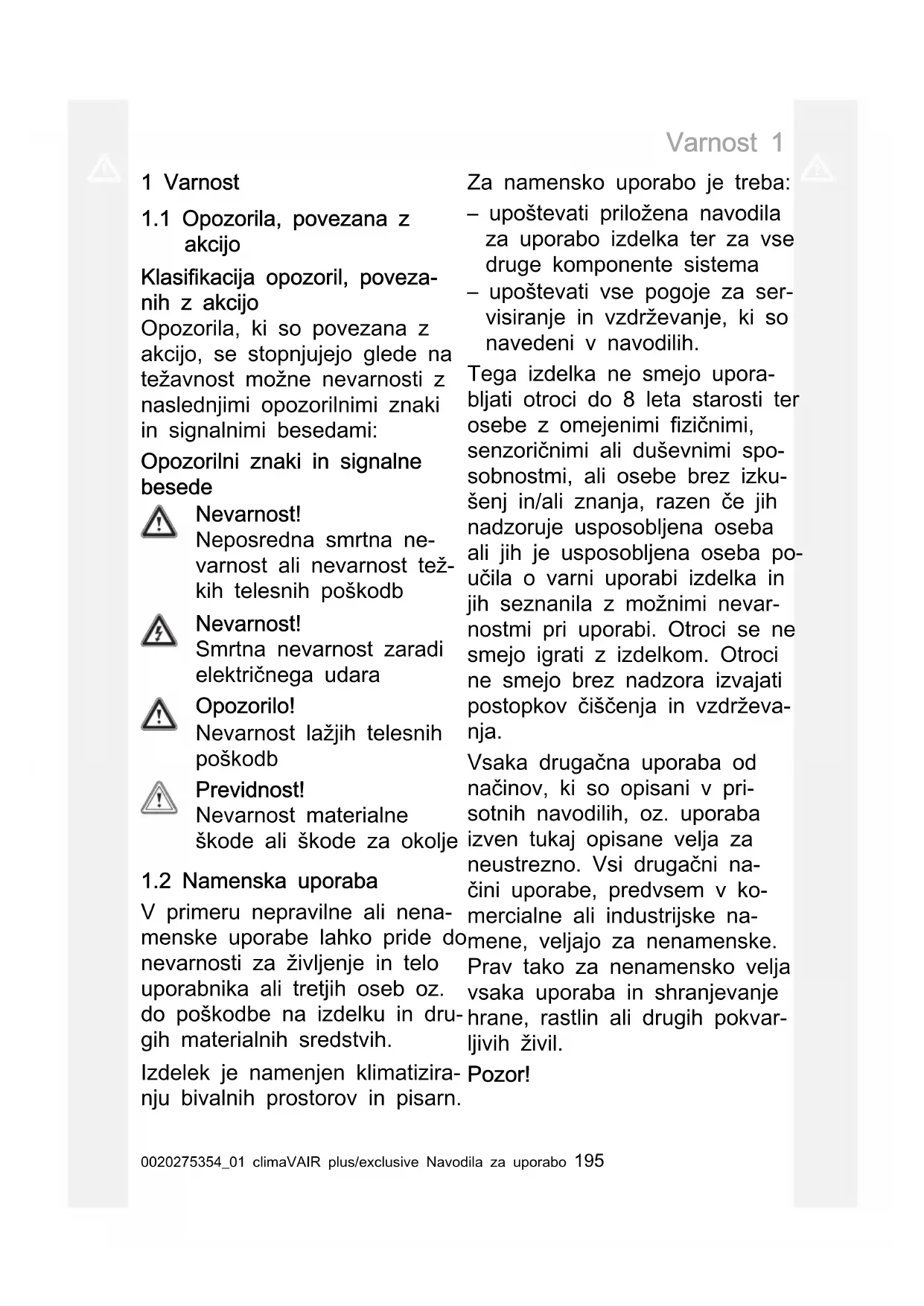 V primeru nepravilne ali nena- menske uporabe lahko pride do nevarnosti za življenje in telo uporabnika ali tretjih oseb oz. do poškodbe na izdelku in dru- gih materialnih sredstvih. Izdelek je namenjen klimatizira- nju bivalnih prostorov in pisarn. Za namensko uporabo je treba: – upoštevati priložena navodila za uporabo izdelka ter za vse druge komponente sistema – upoštevati vse pogoje za ser- visiranje in vzdrževanje, ki so navedeni v navodilih. Tega izdelka ne smejo upora- bljati otroci do 8 leta starosti ter osebe z omejenimi fizičnimi, senzoričnimi ali duševnimi spo- sobnostmi, ali osebe brez izku- šenj in/ali znanja, razen če jih nadzoruje usposobljena oseba ali jih je usposobljena oseba po- učila o varni uporabi izdelka in jih seznanila z možnimi nevar- nostmi pri uporabi. Otroci se ne smejo igrati z izdelkom. Otroci ne smejo brez nadzora izvajati postopkov čiščenja in vzdrževa- nja. Vsaka drugačna uporaba od načinov, ki so opisani v pri- sotnih navodilih, oz. uporaba izven tukaj opisane velja za neustrezno. Vsi drugačni na- čini uporabe, predvsem v ko- mercialne ali industrijske na- mene, veljajo za nenamenske. Prav tako za nenamensko velja vsaka uporaba in shranjevanje hrane, rastlin ali drugih pokvar- ljivih živil. Pozor!1 Varnost 196 Navodila za uporabo climaVAIR plus/exclusive 0020275354_01 Vsakršna zloraba je prepove- dana.