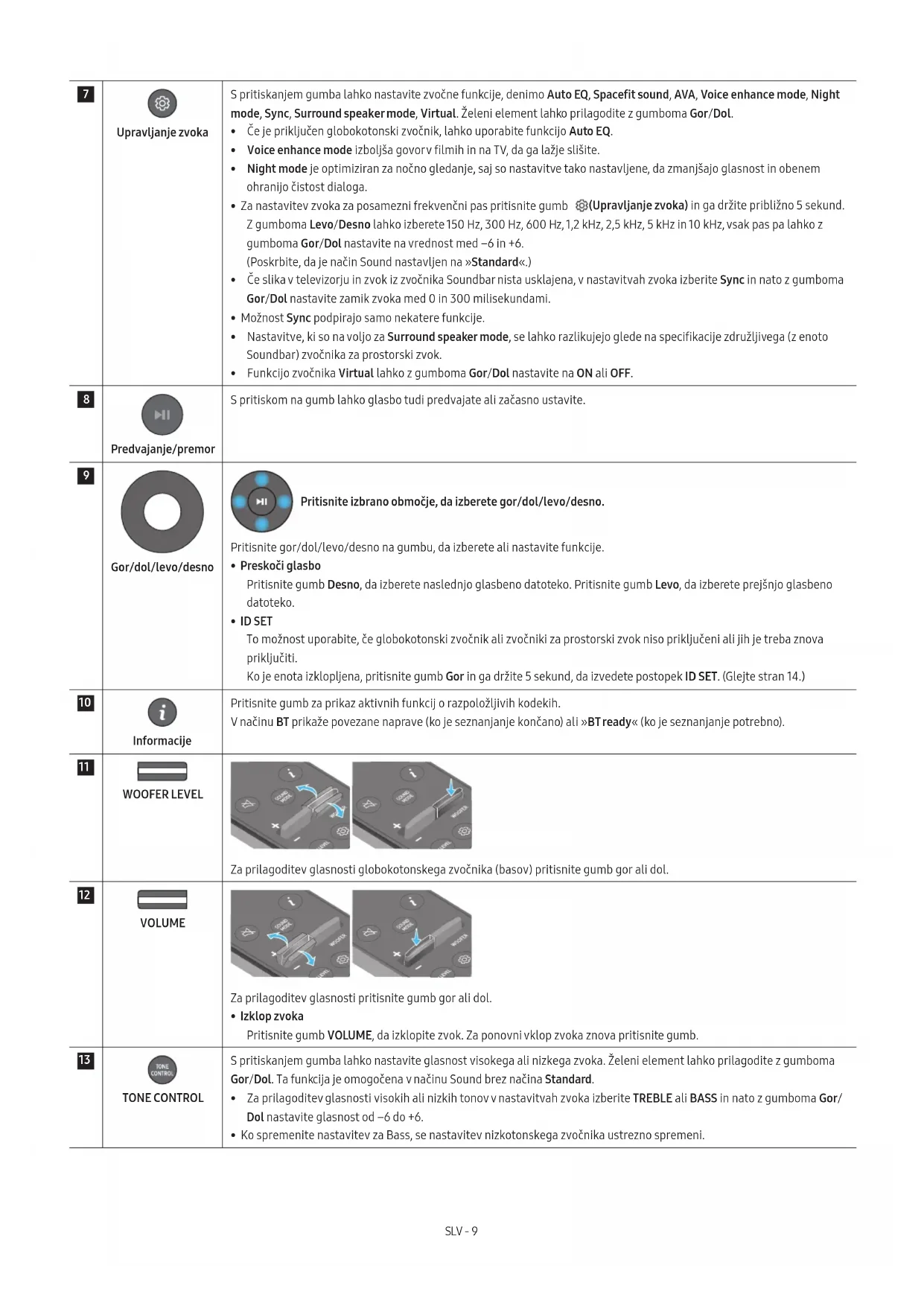 Vsakič, ko gumb WOOFER pritisnete navzgor in ga pridržite 5 sekund, se način preklopi v tem vrstnem redu: »OFF-TV REMOTE« (privzeti način), »SAMSUNG-TV REMOTE«, »ALL-TV REMOTE«. Gumb na daljinskem upravljalniku Prikaz Stanje (Privzeti način) OFF-TV REMOTE Onemogočite daljinski upravljalnik televizorja. SAMSUNG-TV REMOTE Omogočite daljinski upravljalnik IR televizorja Samsung. ALL-TV REMOTE Omogočite daljinski upravljalnik IR televizorja drugega proizvajalca.SLV - 12