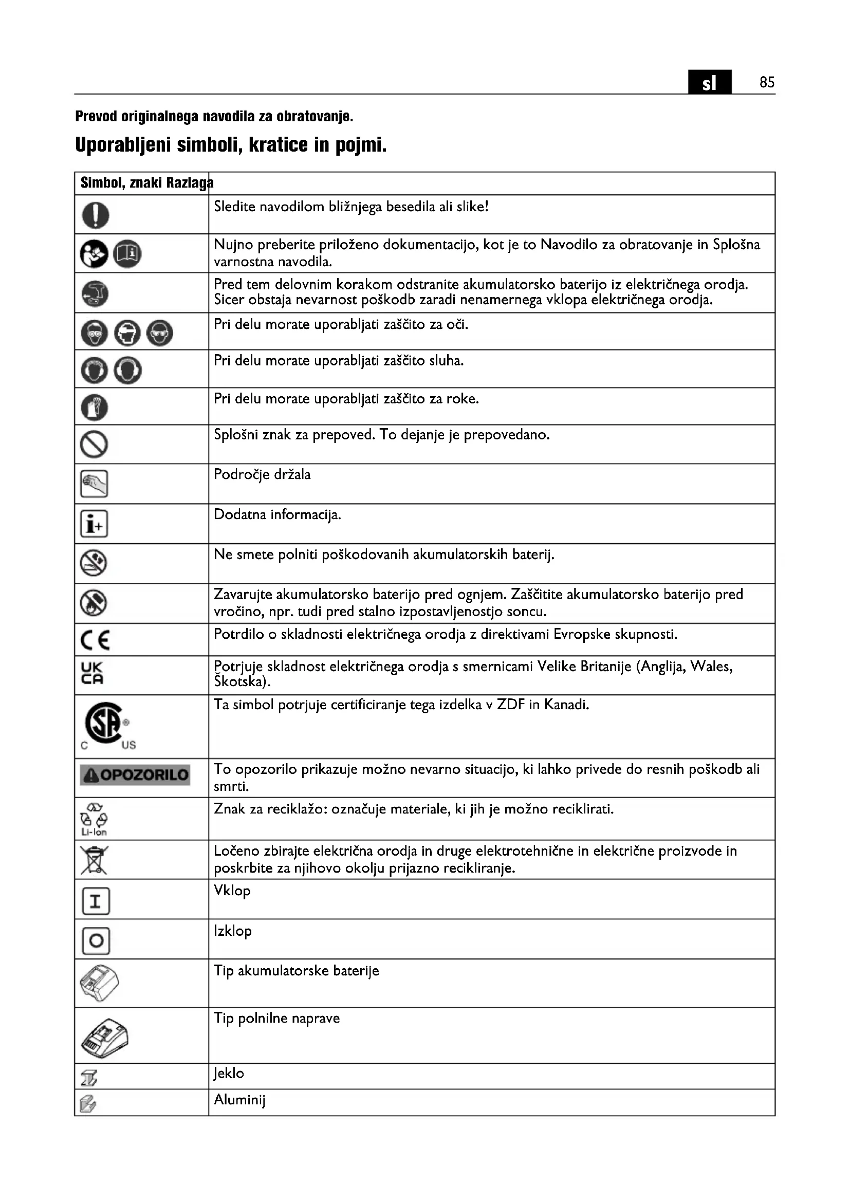 Prevod originalnega navodila za obratovanje. Uporabljeni simboli, kratice in pojmi. Simbol, znaki Razlaga Sledite navodilom bližnjega besedila ali slike! Nujno preberite priloženo dokumentacijo, kot je to Navodilo za obratovanje in Splošna varnostna navodila. Pred tem delovnim korakom odstranite akumulatorsko baterijo iz električnega orodja. Sicer obstaja nevarnost poškodb zaradi nenamernega vklopa električnega orodja. Pri delu morate uporabljati zaščito za oči. Pri delu morate uporabljati zaščito sluha. Pri delu morate uporabljati zaščito za roke. Splošni znak za prepoved. To dejanje je prepovedano. Področje držala Dodatna informacija. Ne smete polniti poškodovanih akumulatorskih baterij. Zavarujte akumulatorsko baterijo pred ognjem. Zaščitite akumulatorsko baterijo pred vročino, npr. tudi pred stalno izpostavljenostjo soncu. Potrdilo o skladnosti električnega orodja z direktivami Evropske skupnosti. Potrjuje skladnost električnega orodja s smernicami Velike Britanije (Anglija, Wales, Škotska). Ta simbol potrjuje certificiranje tega izdelka v ZDF in Kanadi. To opozorilo prikazuje možno nevarno situacijo, ki lahko privede do resnih poškodb ali smrti. Znak za reciklažo: označuje materiale, ki jih je možno reciklirati. Ločeno zbirajte električna orodja in druge elektrotehnične in električne proizvode in poskrbite za njihovo okolju prijazno recikliranje. Vklop Izklop Tip akumulatorske baterije Tip polnilne naprave Jeklo Aluminij86