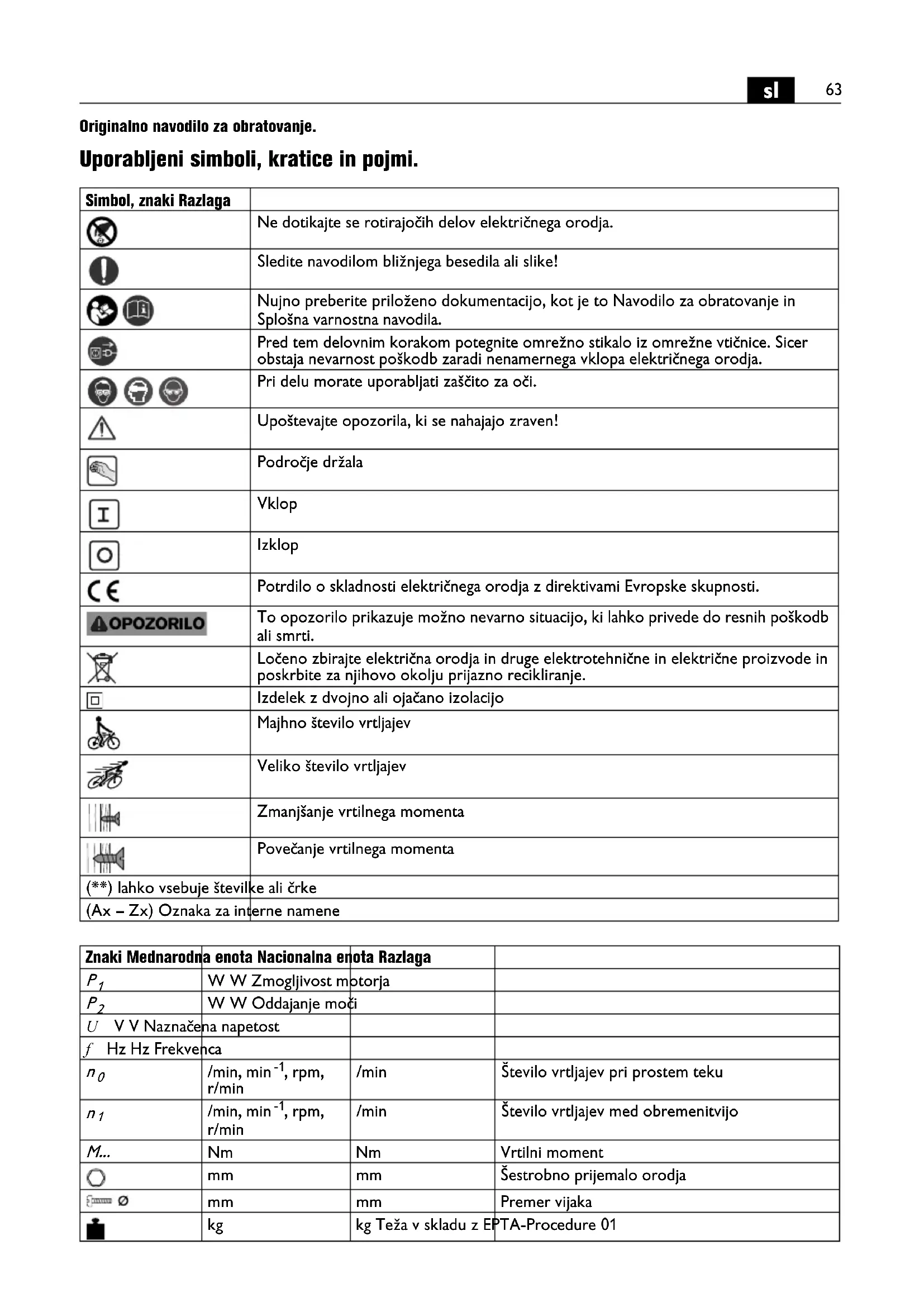 Originalno navodilo za obratovanje. Uporabljeni simboli, kratice in pojmi. Simbol, znaki Razlaga Ne dotikajte se rotirajočih delov električnega orodja. Sledite navodilom bližnjega besedila ali slike! Nujno preberite priloženo dokumentacijo, kot je to Navodilo za obratovanje in Splošna varnostna navodila. Pred tem delovnim korakom potegnite omrežno stikalo iz omrežne vtičnice. Sicer obstaja nevarnost poškodb zaradi nenamernega vklopa električnega orodja. Pri delu morate uporabljati zaščito za oči. Upoštevajte opozorila, ki se nahajajo zraven! Področje držala Vklop Izklop Potrdilo o skladnosti električnega orodja z direktivami Evropske skupnosti. To opozorilo prikazuje možno nevarno situacijo, ki lahko privede do resnih poškodb ali smrti. Ločeno zbirajte električna orodja in druge elektrotehnične in električne proizvode in poskrbite za njihovo okolju prijazno recikliranje. Izdelek z dvojno ali ojačano izolacijo Majhno število vrtljajev Veliko število vrtljajev Zmanjšanje vrtilnega momenta Povečanje vrtilnega momenta (**) lahko vsebuje številke ali črke (Ax – Zx) Oznaka za interne namene Znaki Mednarodna enota Nacionalna enota Razlaga