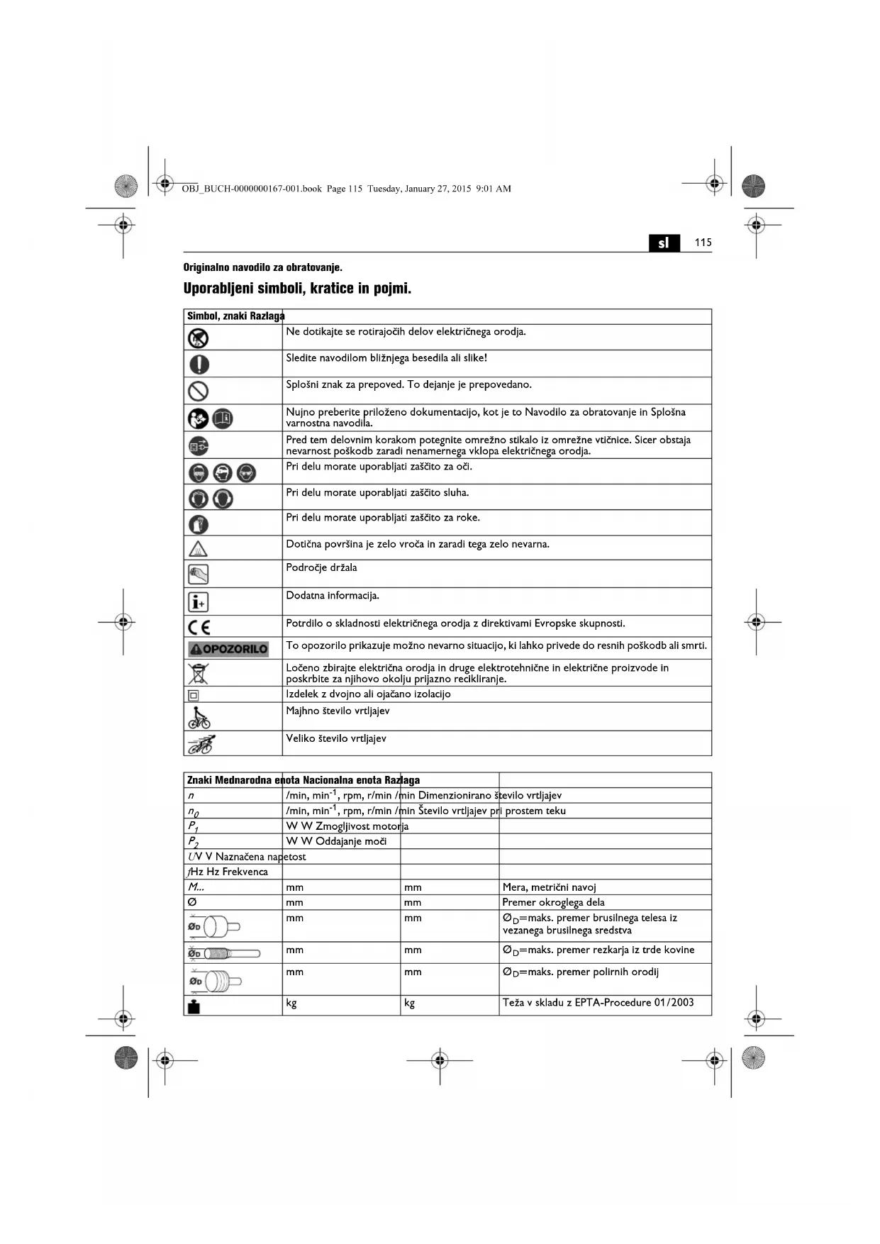 Originalno navodilo za obratovanje. Uporabljeni simboli, kratice in pojmi. Simbol, znaki Razlaga Ne dotikajte se rotirajočih delov električnega orodja. Sledite navodilom bližnjega besedila ali slike! Splošni znak za prepoved. To dejanje je prepovedano. Nujno preberite priloženo dokumentacijo, kot je to Navodilo za obratovanje in Splošna varnostna navodila. Pred tem delovnim korakom potegnite omrežno stikalo iz omrežne vtičnice. Sicer obstaja nevarnost poškodb zaradi nenamernega vklopa električnega orodja. Pri delu morate uporabljati zaščito za oči. Pri delu morate uporabljati zaščito sluha. Pri delu morate uporabljati zaščito za roke. Dotična površina je zelo vroča in zaradi tega zelo nevarna. Področje držala Dodatna informacija. Potrdilo o skladnosti električnega orodja z direktivami Evropske skupnosti. To opozorilo prikazuje možno nevarno situacijo, ki lahko privede do resnih poškodb ali smrti. Ločeno zbirajte električna orodja in druge elektrotehnične in električne proizvode in poskrbite za njihovo okolju prijazno recikliranje. Izdelek z dvojno ali ojačano izolacijo Majhno število vrtljajev Veliko število vrtljajev Znaki Mednarodna enota Nacionalna enota Razlaga