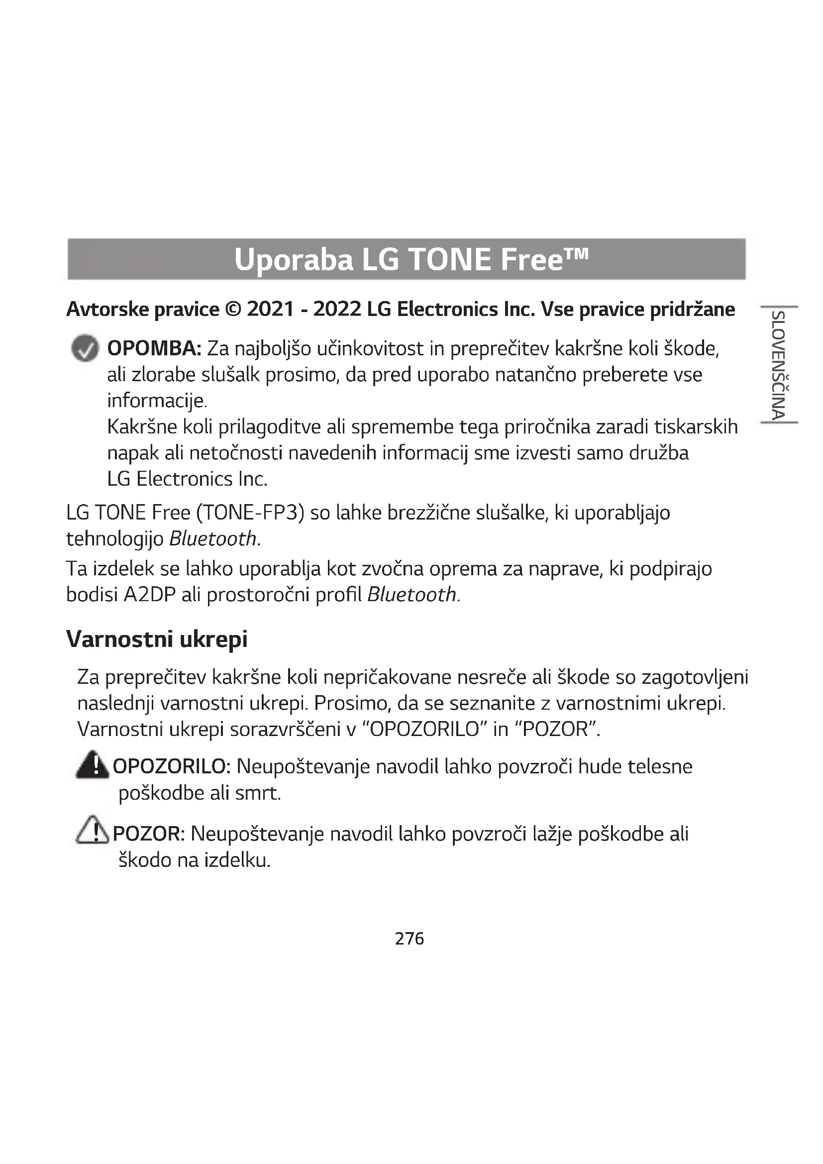 Avtorske pravice © 2021 - 2022 LG Electronics Inc. Vse pravice pridržane OPOMBA: Za najboljšo učinkovitost in preprečitev kakršne koli škode, ali zlorabe slušalk prosimo, da pred uporabo natančno preberete vse informacije. Kakršne koli prilagoditve ali spremembe tega priročnika zaradi tiskarskih napak ali netočnosti navedenih informacij sme izvesti samo družba LG Electronics Inc. LG TONE Free (TONE-FP3) so lahke brezžične slušalke, ki uporabljajo tehnologijo Bluetooth. Ta izdelek se lahko uporablja kot zvočna oprema za naprave, ki podpirajo bodisi A2DP ali prostoročni prol Bluetooth. Varnostni ukrepi Za preprečitev kakršne koli nepričakovane nesreče ali škode so zagotovljeni naslednji varnostni ukrepi. Prosimo, da se seznanite z varnostnimi ukrepi. Varnostni ukrepi sorazvrščeni v “OPOZORILO” in “POZOR”.