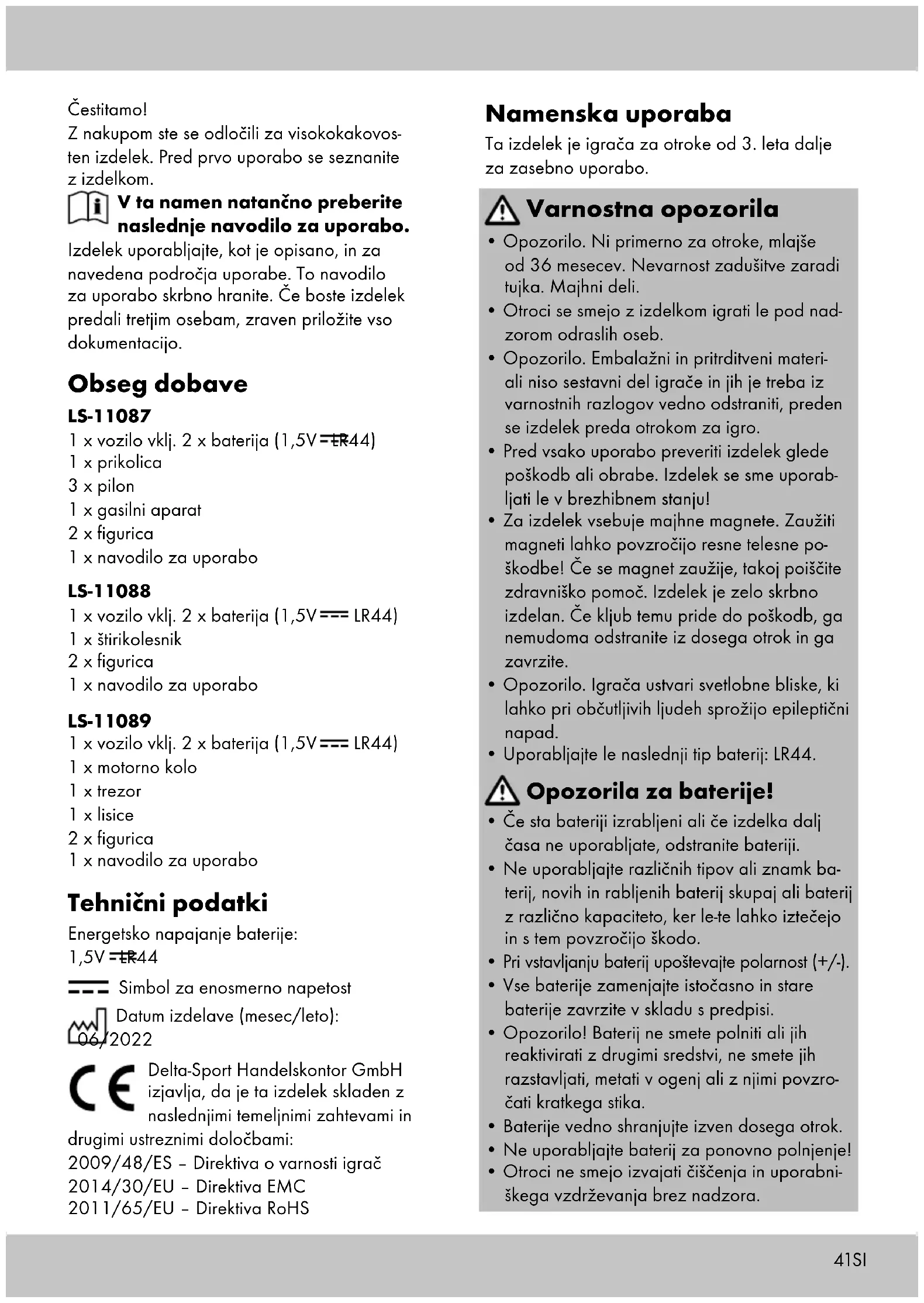- Opozorilo. Embalažni in pritrditveni materi- ali niso sestavni del igrače in jih je treba iz varnostnih razlogov vedno odstraniti, preden se izdelek preda otrokom za igro.