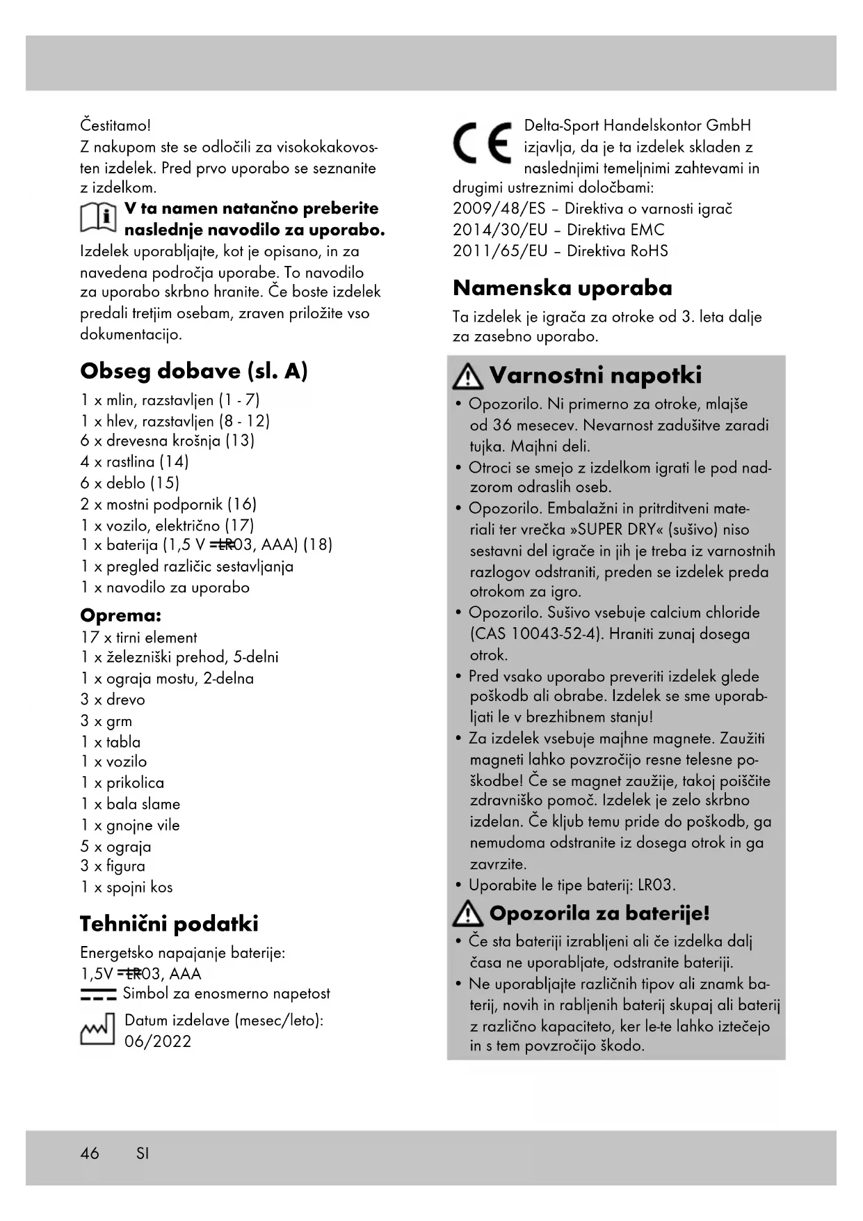 Simbol za enosmerno napetost Datum izdelave (mesec/leto): 06/2022 Delta-Sport Handelskontor GmbH izjavlja, da je ta izdelek skladen z naslednjimi temeljnimi zahtevami in drugimi ustreznimi določbami: 2009/48/ES – Direktiva o varnosti igrač 2014/30/EU – Direktiva EMC 2011/65/EU – Direktiva RoHS Namenska uporaba Ta izdelek je igrača za otroke od 3. leta dalje za zasebno uporabo. Varnostni napotki