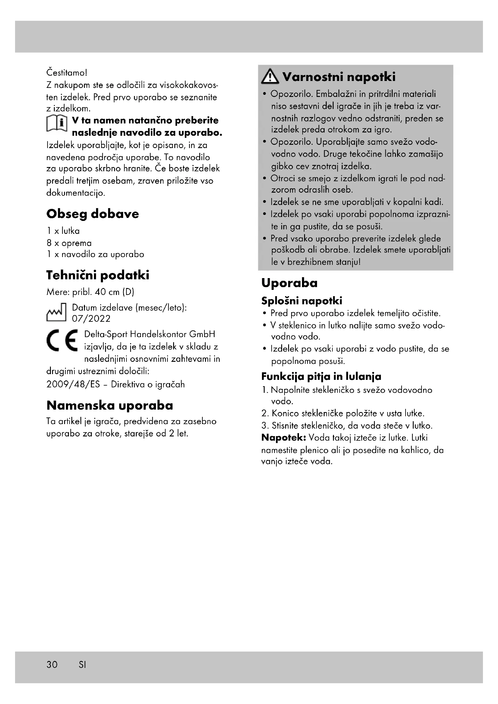 Napotek: Voda takoj izteče iz lutke. Lutki namestite plenico ali jo posedite na kahlico, da vanjo izteče voda. SI31SI Shranjevanje, čiščenje Če izdelka ne uporabljate, ga shranite na suho, čisto mesto pri sobni temperaturi. Čistite le z vlažno krpo za čiščenje in nato do suhega obrišite. Po vsaki uporabi izdelek izpraznite in ga pustite, da se popolnoma posuši, da preprečite nastaja- nje plesni. Lutko in stekleničko operite z milnico približno vsaka dva tedna. Nato še vsaj dvakrat sperite z vodovodno vodo, da zagotovite, da v lutki ali steklenički ne ostane- jo ostanki mila. POMEMBNO! Nikoli ne čistite z ostrimi čistilnimi sredstvi. Bodi, kapa in plenica: 30 °C občutljivo perilo Napotki za odlaganje v smeti Izdelek in embalažne materiale zavrzite v skladu z aktualnimi lokalnimi predpisi. Emba- lažni materiali, npr. folijske vrečke, ne sodijo v roke otrok. Embalažni material shranite otrokom nedosegljivo. Izdelke in embalažo odstranite okolju prijazno. Koda za recikliranje označuje različne materiale za vračanje v reciklirni krog. Vsebuje simbol za recikliranje, ki označu- je reciklirni krog, in številko, ki označuje material. Napotki za garancijo in izvajanje servisne storitve Izdelek je bil izdelan z veliko skrbnostjo in pod stalno kontrolo. DELTA-SPORT HANDELSKON- TOR GmbH zasebnim končnim kupcem od datuma nakupa (garancijskega obdobja) v skladu z naslednjimi določbami odobri triletno garancijo na to postavko. Garancija velja samo za napake v materialu in obdelavi. Garancija ne velja za dele, ki so podvrženi običajni obrabi in jih je zato treba šteti za obrabljive dele (npr. baterije), in za lomljive dele, kot so npr. stikala, akumulatorji ali deli iz stekla. Zahtevki iz te garancije so izključeni, če je bil izdelek uporabljen nepravilno ali pretirano ali če ni bil uporabljen v okviru predvidenega namena ali predvidenega obsega uporabe ali če niso bile upoštevane specifikacije v navodilih za uporabo, razen če končni kupec lahko dokaže, da gre za napako v materialu ali izdelavi, ki ne temelji na eni od zgoraj navedenih okoliščin. Garancijski zahtevki se lahko uveljavljajo le v garancijskem roku ob predložitvi originalnega računa. Zato originalni račun shranite. Garancij- ski čas se zaradi morebitnih popravil na podlagi garancije, zakonskega jamstva ali kulance ne podaljša. To velja tudi za zamenjane in popra- vljene dele. Pri morebitnih reklamacijah se najprej obrnite na spodaj navedeno servisno številko za nujne primere ali stopite z nami v stik po elektronski pošti. Če obstaja garancijski primer, vam bomo izdelek po naši izbiri brezplačno popravili, zamenjali ali pa vam bomo povrnili kupnino. Druge pravice iz garancije ne obstajajo. Ta garancija ne omejuje vaših zakonskih pravic, še posebej garancijskih zahtevkov do prodajal- ca. IAN: 403705_2201 Servis Slovenija Tel.: 080080917 E-Mail: deltasport@lidl.si32 Garancijski list