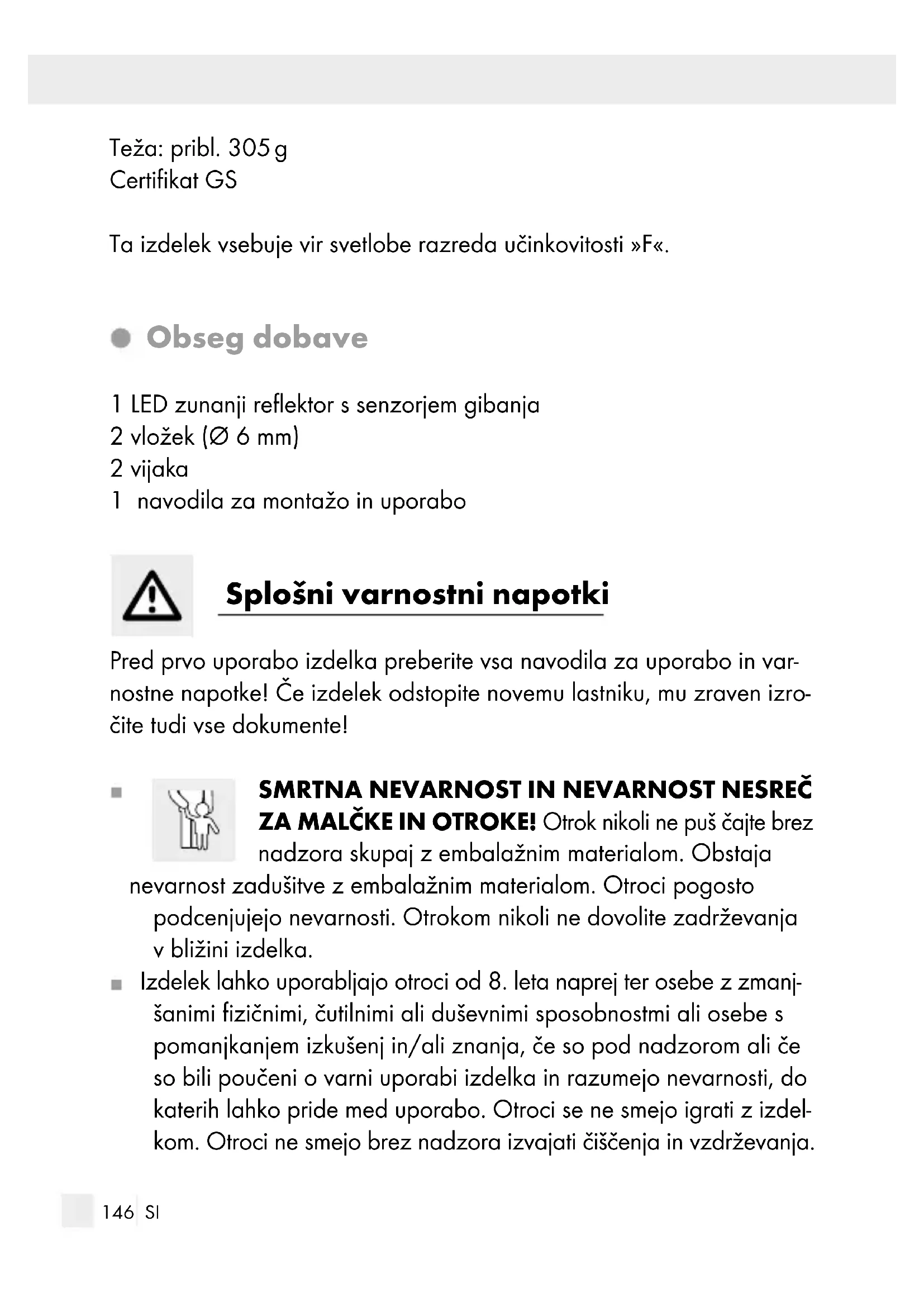 Montažna višina: pribl. 2,5 m146 SI Teža: pribl. 305 g Certifikat GS Ta izdelek vsebuje vir svetlobe razreda učinkovitosti »F«. Obseg dobave 1 LED zunanji reflektor s senzorjem gibanja 2 vložek (Ø 6 mm) 2 vijaka 1 navodila za montažo in uporabo Splošni varnostni napotki Pred prvo uporabo izdelka preberite vsa navodila za uporabo in var- nostne napotke! Če izdelek odstopite novemu lastniku, mu zraven izro- čite tudi vse dokumente!