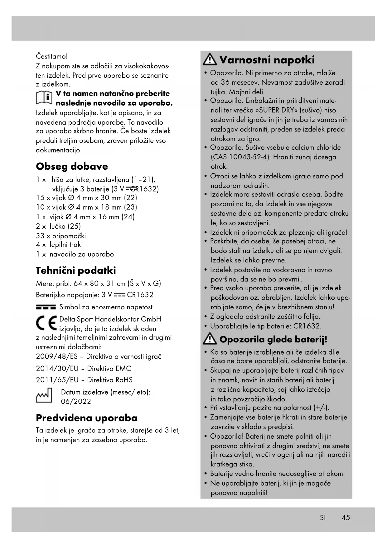 lučke (25). Zvonec pritrdite na hišo za lutke. Shranjevanje, čiščenje Če izdelka ne uporabljate, iz njega vedno vze- mite baterije in ga shranite na suho, čisto mesto pri sobni temperaturi. Izdelek čistite le tako, da ga obrišete s suho krpo za čiščenje. Tekstil čistite le pod hladno vodo in pustite, da se posuši pri sobni temperaturi. POMEMBNO! Nikoli ne čistite z ostrimi čistilnimi sredstvi. Napotki za odlaganje v smeti Odsluženega izdelka zaradi varovanja okolja ne zavrzite med gospodinjske odpadke, temveč ga predajte na ustreznem mestu za zbiranje odpadkov. SI47 O zbirnih mestih in njihovih odpiralnih časih se lahko pozanimate pri pristojni upravni enoti. Okvarjene ali izrabljene baterije/akumulatorske baterije je v skladu z Direktivo 2006/66/ES in njenih spremembah treba reciklirati. Baterije/ akumulatorske baterije in/ali izdelek oddajte na postavljenih zbirnih mestih. Embalaža, npr. vreč- ke iz folije, ne sodijo v otroške roke. Embalažo shranite nedosegljivo otrokom. Okoljska škoda zaradi napačnega odstranjevanja baterij/akumulatorskih baterij! Baterij/akumulatorskih baterij ni dovoljeno odlagati med gospodinjske odpadke. Lahko vsebujejo težke kovine, zato so podvržene predelavi posebnih odpadkov. Kemični simboli težkih kovin so naslednji: Cd = kadmij, Hg = živo srebro, Pb = svinec. Izrabljene baterije/akumulatorske baterije zato oddajte na komunalnem zbirnem mestu. Izdelek in embalažo zavrzite na okolju prijazen način. Pri ločevanju odpadkov upoštevajte oznake embalažnih materialov. Označeni so s kraticami (a) in številkami (b) z naslednjim pomenom: 1–7: umetne mase/20–22: papir in lepenka/ 80–98: kompozitni materiali. Izdelek in embalažne materiale je mogoče reci- klirati, zato jih zavrzite ločeno, da jih je mogoče lažje predelati. Logotip Triman velja samo za Francijo. O možnostih odstranjevanja odsluženih izdelkov lahko izveste pri svoji občinski ali mestni upravi. Napotki za garancijo in izvajanje servisne storitve Izdelek je bil izdelan z veliko skrbnostjo in pod stalno kontrolo. DELTA-SPORT HANDELSKONTOR GmbH zasebnim končnim kupcem od datuma nakupa (garancijskega ob- dobja) v skladu z naslednjimi določbami odobri triletno garancijo na to postavko. Garancija velja samo za napake v materialu in obdelavi. Garancija ne velja za dele, ki so podvrženi obi- čajni obrabi in jih je zato treba šteti za obrablji- ve dele (npr. baterije), in za lomljive dele, kot so npr. stikala, akumulatorji ali deli iz stekla. Zahtevki iz te garancije so izključeni, če je bil izdelek uporabljen nepravilno ali pretirano ali če ni bil uporabljen v okviru predvidenega namena ali predvidenega obsega uporabe ali če niso bile upoštevane specifikacije v navodilih za uporabo, razen če končni kupec lahko dokaže, da gre za napako v materialu ali izdelavi, ki ne temelji na eni od zgoraj navedenih okoliščin. Garancijski zahtevki se lahko uveljavljajo le v garancijskem roku ob predložitvi originalnega računa. Zato originalni račun shranite. Garancij- ski čas se zaradi morebitnih popravil na podlagi garancije, zakonskega jamstva ali kulance ne podaljša. To velja tudi za zamenjane in popra- vljene dele. Pri morebitnih reklamacijah se najprej obrnite na spodaj navedeno servisno številko za nujne primere ali stopite z nami v stik po elektronski pošti. Če obstaja garancijski primer, vam bomo izdelek po naši izbiri brezplačno popravili, zamenjali ali pa vam bomo povrnili kupnino. Druge pravice iz garancije ne obstajajo. Ta garancija ne omejuje vaših zakonskih pravic, še posebej garancijskih zahtevkov do prodajal- ca. IAN: 393053_2201 Servis Slovenija Tel.: 080080917 E-Mail: deltasport@lidl.si SI48 Garancijski list