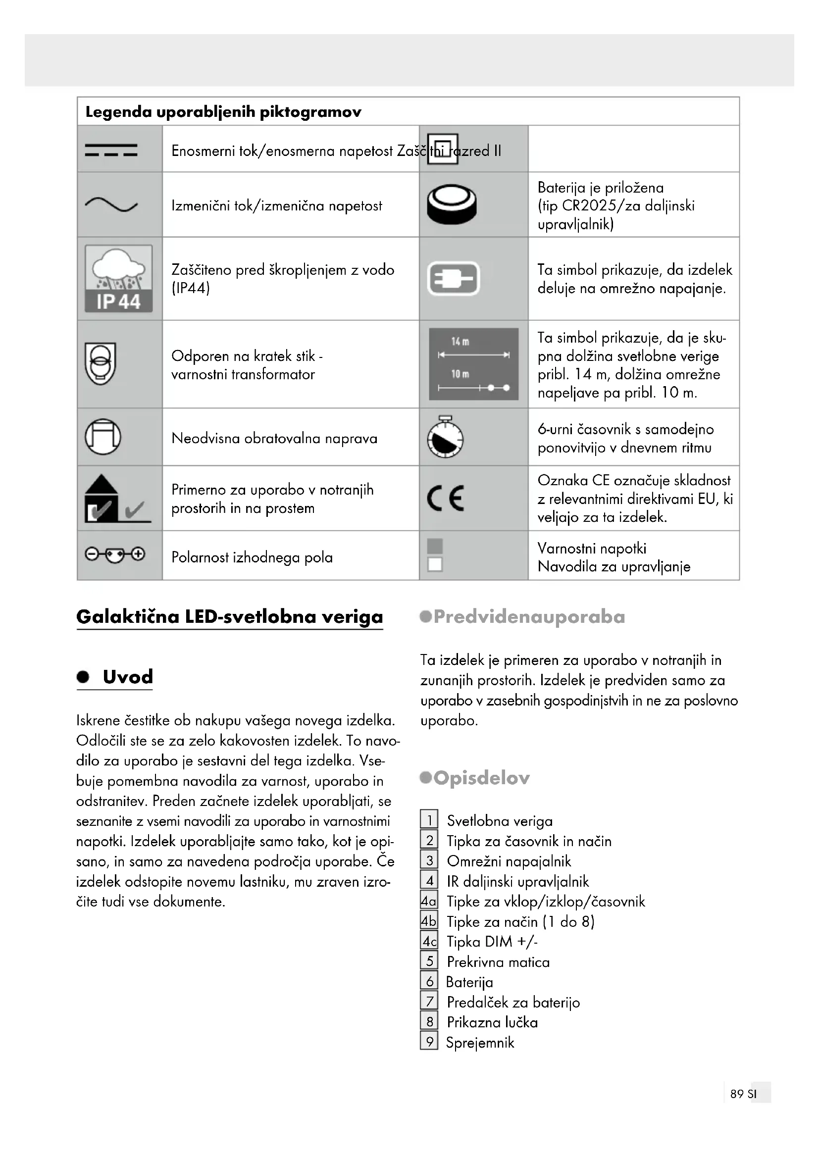 | Odporen na kratek stik - varnostni transformator | Ta simbol prikazuje, da je sku- pna dolžina svetlobne verige pribl. 14 m, dolžina omrežne napeljave pa pribl. 10 m. | ||