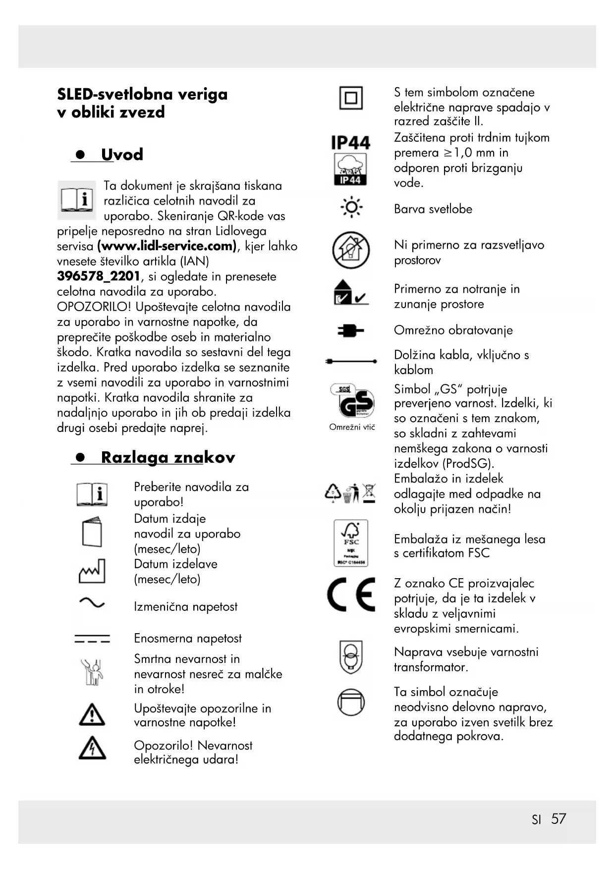 SLED-svetlobna veriga v obliki zvezd z Uvod Ta dokument je skrajšana tiskana različica celotnih navodil za uporabo. Skeniranje QR-kode vas pripelje neposredno na stran Lidlovega servisa (www.lidl-service.com) , kjer lahko vnesete številko artikla (IAN) 396578_2201 , si ogledate in prenesete celotna navodila za uporabo. OPOZORILO! Upoštevajte celotna navodila za uporabo in varnostne napotke, da preprečite poškodbe oseb in materialno škodo. Kratka navodila so sestavni del tega izdelka. Pred uporabo izdelka se seznanite z vsemi navodili za uporabo in varnostnimi napotki. Kratka navodila shranite za nadaljnjo uporabo in jih ob predaji izdelka drugi osebi predajte naprej. z Razlaga znakov Preberite navodila za uporabo! Datum izdaje navodil za uporabo (mesec/leto) Datum izdelave (mesec/leto) Izmenična napetost Enosmerna napetost Smrtna nevarnost in nevarnost nesreč za malčke in otroke! Upoštevajte opozorilne in varnostne napotke! Opozorilo! Nevarnost električnega udara! S tem simbolom označene električne naprave spadajo v razred zaščite II. Zaščitena proti trdnim tujkom premera ≥1,0 mm in odporen proti brizganju vode. Barva svetlobe Ni primerno za razsvetljavo prostorov Primerno za notranje in zunanje prostore Omrežno obratovanje Dolžina kabla, vključno s kablom Omrežni vtič Simbol „GS“ potrjuje preverjeno varnost. Izdelki, ki so označeni s tem znakom, so skladni z zahtevami nemškega zakona o varnosti izdelkov (ProdSG). Embalažo in izdelek odlagajte med odpadke na okolju prijazen način! Embalaža iz mešanega lesa s certikatom FSC Z oznako CE proizvajalec potrjuje, da je ta izdelek v skladu z veljavnimi evropskimi smernicami. Naprava vsebuje varnostni transformator. Ta simbol označuje neodvisno delovno napravo, za uporabo izven svetilk brez dodatnega pokrova.58