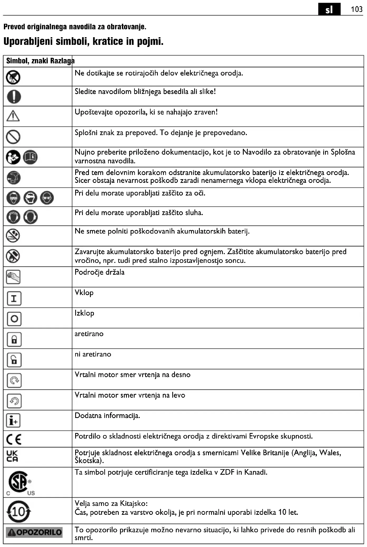 Prevod originalnega navodila za obratovanje. Uporabljeni simboli, kratice in pojmi. Simbol, znaki Razlaga Ne dotikajte se rotirajočih delov električnega orodja. Sledite navodilom bližnjega besedila ali slike! Upoštevajte opozorila, ki se nahajajo zraven! Splošni znak za prepoved. To dejanje je prepovedano. Nujno preberite priloženo dokumentacijo, kot je to Navodilo za obratovanje in Splošna varnostna navodila. Pred tem delovnim korakom odstranite akumulatorsko baterijo iz električnega orodja. Sicer obstaja nevarnost poškodb zaradi nenamernega vklopa električnega orodja. Pri delu morate uporabljati zaščito za oči. Pri delu morate uporabljati zaščito sluha. Ne smete polniti poškodovanih akumulatorskih baterij. Zavarujte akumulatorsko baterijo pred ognjem. Zaščitite akumulatorsko baterijo pred vročino, npr. tudi pred stalno izpostavljenostjo soncu. Področje držala Vklop Izklop aretirano ni aretirano Vrtalni motor smer vrtenja na desno Vrtalni motor smer vrtenja na levo Dodatna informacija. Potrdilo o skladnosti električnega orodja z direktivami Evropske skupnosti. Potrjuje skladnost električnega orodja s smernicami Velike Britanije (Anglija, Wales, Škotska). Ta simbol potrjuje certificiranje tega izdelka v ZDF in Kanadi. Velja samo za Kitajsko: Čas, potreben za varstvo okolja, je pri normalni uporabi izdelka 10 let. To opozorilo prikazuje možno nevarno situacijo, ki lahko privede do resnih poškodb ali smrti.104