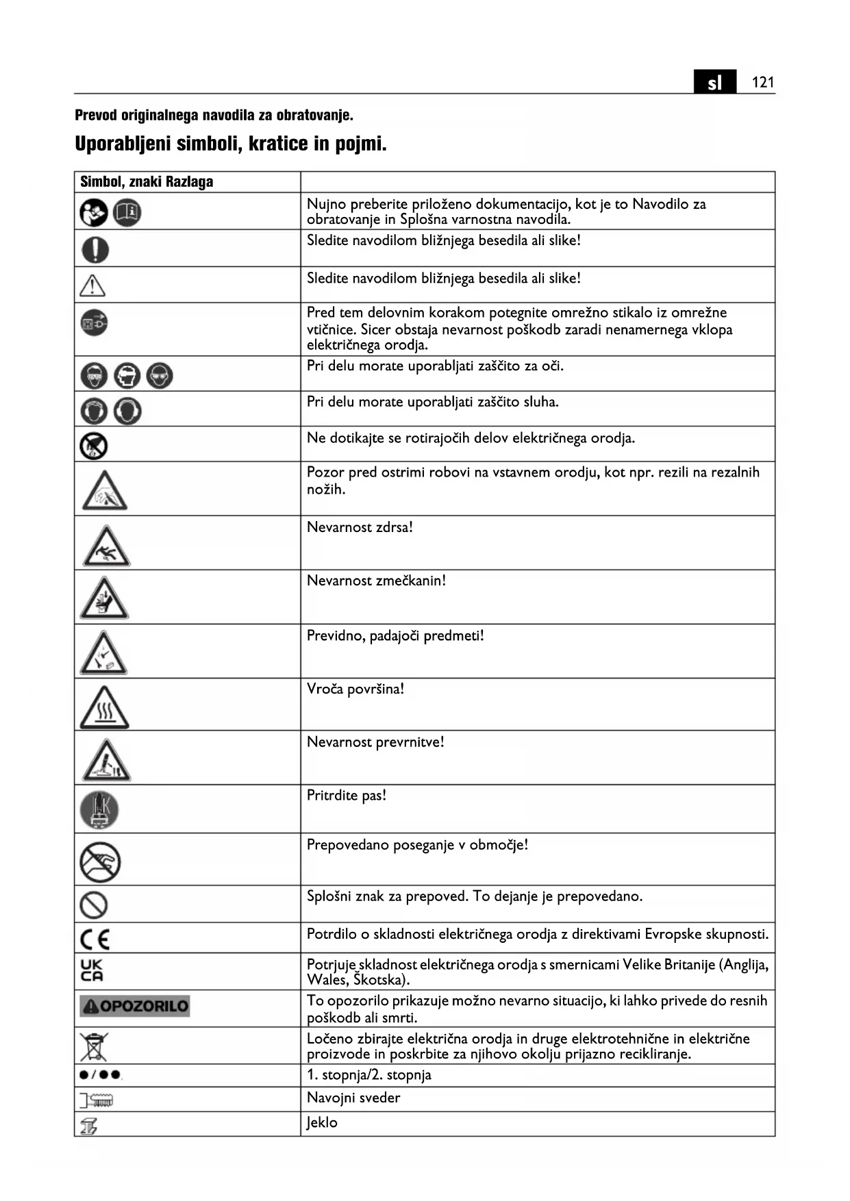 Prevod originalnega navodila za obratovanje. Uporabljeni simboli, kratice in pojmi. Simbol, znaki Razlaga Nujno preberite priloženo dokumentacijo, kot je to Navodilo za obratovanje in Splošna varnostna navodila. Sledite navodilom bližnjega besedila ali slike! Sledite navodilom bližnjega besedila ali slike! Pred tem delovnim korakom potegnite omrežno stikalo iz omrežne vtičnice. Sicer obstaja nevarnost poškodb zaradi nenamernega vklopa električnega orodja. Pri delu morate uporabljati zaščito za oči. Pri delu morate uporabljati zaščito sluha. Ne dotikajte se rotirajočih delov električnega orodja. Pozor pred ostrimi robovi na vstavnem orodju, kot npr. rezili na rezalnih nožih. Nevarnost zdrsa! Nevarnost zmečkanin! Previdno, padajoči predmeti! Vroča površina! Nevarnost prevrnitve! Pritrdite pas! Prepovedano poseganje v območje! Splošni znak za prepoved. To dejanje je prepovedano. Potrdilo o skladnosti električnega orodja z direktivami Evropske skupnosti. Potrjuje skladnost električnega orodja s smernicami Velike Britanije (Anglija, Wales, Škotska). To opozorilo prikazuje možno nevarno situacijo, ki lahko privede do resnih poškodb ali smrti. Ločeno zbirajte električna orodja in druge elektrotehnične in električne proizvode in poskrbite za njihovo okolju prijazno recikliranje.