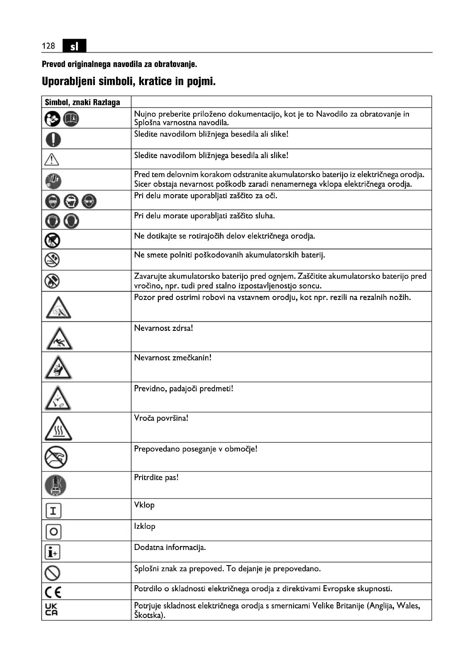 Prevod originalnega navodila za obratovanje. Uporabljeni simboli, kratice in pojmi. Simbol, znaki Razlaga Nujno preberite priloženo dokumentacijo, kot je to Navodilo za obratovanje in Splošna varnostna navodila. Sledite navodilom bližnjega besedila ali slike! Sledite navodilom bližnjega besedila ali slike! Pred tem delovnim korakom odstranite akumulatorsko baterijo iz električnega orodja. Sicer obstaja nevarnost poškodb zaradi nenamernega vklopa električnega orodja. Pri delu morate uporabljati zaščito za oči. Pri delu morate uporabljati zaščito sluha. Ne dotikajte se rotirajočih delov električnega orodja. Ne smete polniti poškodovanih akumulatorskih baterij. Zavarujte akumulatorsko baterijo pred ognjem. Zaščitite akumulatorsko baterijo pred vročino, npr. tudi pred stalno izpostavljenostjo soncu. Pozor pred ostrimi robovi na vstavnem orodju, kot npr. rezili na rezalnih nožih. Nevarnost zdrsa! Nevarnost zmečkanin! Previdno, padajoči predmeti! Vroča površina! Prepovedano poseganje v območje! Pritrdite pas! Vklop Izklop Dodatna informacija. Splošni znak za prepoved. To dejanje je prepovedano. Potrdilo o skladnosti električnega orodja z direktivami Evropske skupnosti. Potrjuje skladnost električnega orodja s smernicami Velike Britanije (Anglija, Wales, Škotska).129