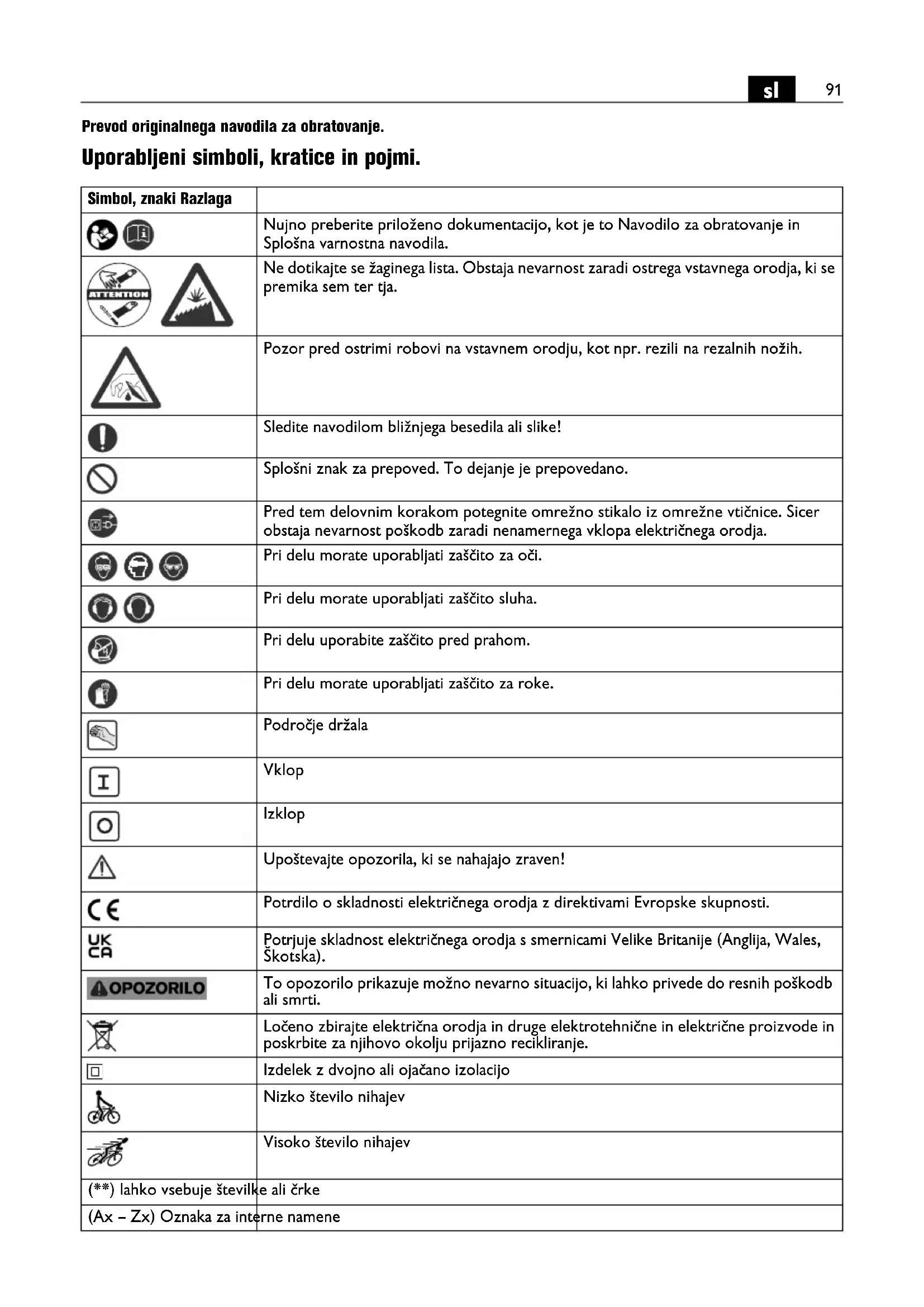 Prevod originalnega navodila za obratovanje. Uporabljeni simboli, kratice in pojmi. Simbol, znaki Razlaga Nujno preberite priloženo dokumentacijo, kot je to Navodilo za obratovanje in Splošna varnostna navodila. Ne dotikajte se žaginega lista. Obstaja nevarnost zaradi ostrega vstavnega orodja, ki se premika sem ter tja. Pozor pred ostrimi robovi na vstavnem orodju, kot npr. rezili na rezalnih nožih. Sledite navodilom bližnjega besedila ali slike! Splošni znak za prepoved. To dejanje je prepovedano. Pred tem delovnim korakom potegnite omrežno stikalo iz omrežne vtičnice. Sicer obstaja nevarnost poškodb zaradi nenamernega vklopa električnega orodja. Pri delu morate uporabljati zaščito za oči. Pri delu morate uporabljati zaščito sluha. Pri delu uporabite zaščito pred prahom. Pri delu morate uporabljati zaščito za roke. Področje držala Vklop Izklop Upoštevajte opozorila, ki se nahajajo zraven! Potrdilo o skladnosti električnega orodja z direktivami Evropske skupnosti. Potrjuje skladnost električnega orodja s smernicami Velike Britanije (Anglija, Wales, Škotska). To opozorilo prikazuje možno nevarno situacijo, ki lahko privede do resnih poškodb ali smrti. Ločeno zbirajte električna orodja in druge elektrotehnične in električne proizvode in poskrbite za njihovo okolju prijazno recikliranje. Izdelek z dvojno ali ojačano izolacijo Nizko število nihajev Visoko število nihajev (**) lahko vsebuje številke ali črke (Ax – Zx) Oznaka za interne namene92