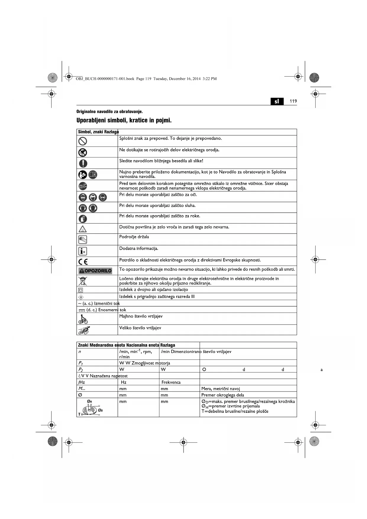 Originalno navodilo za obratovanje. Uporabljeni simboli, kratice in pojmi. Simbol, znaki Razlaga Splošni znak za prepoved. To dejanje je prepovedano. Ne dotikajte se rotirajočih delov električnega orodja. Sledite navodilom bližnjega besedila ali slike! Nujno preberite priloženo dokumentacijo, kot je to Navodilo za obratovanje in Splošna varnostna navodila. Pred tem delovnim korakom potegnite omrežno stikalo iz omrežne vtičnice. Sicer obstaja nevarnost poškodb zaradi nenamernega vklopa električnega orodja. Pri delu morate uporabljati zaščito za oči. Pri delu morate uporabljati zaščito sluha. Pri delu morate uporabljati zaščito za roke. Dotična površina je zelo vroča in zaradi tega zelo nevarna. Področje držala Dodatna informacija. Potrdilo o skladnosti električnega orodja z direktivami Evropske skupnosti. To opozorilo prikazuje možno nevarno situacijo, ki lahko privede do resnih poškodb ali smrti. Ločeno zbirajte električna orodja in druge elektrotehnične in električne proizvode in poskrbite za njihovo okolju prijazno recikliranje. Izdelek z dvojno ali ojačano izolacijo Izdelek s prigradnjo začitnega razreda III ~ (a. c.) Izmenični tok (d. c.) Enosmerni tok Majhno število vrtljajev Veliko število vrtljajev Znaki Mednarodna enota Nacionalna enota Razlaga