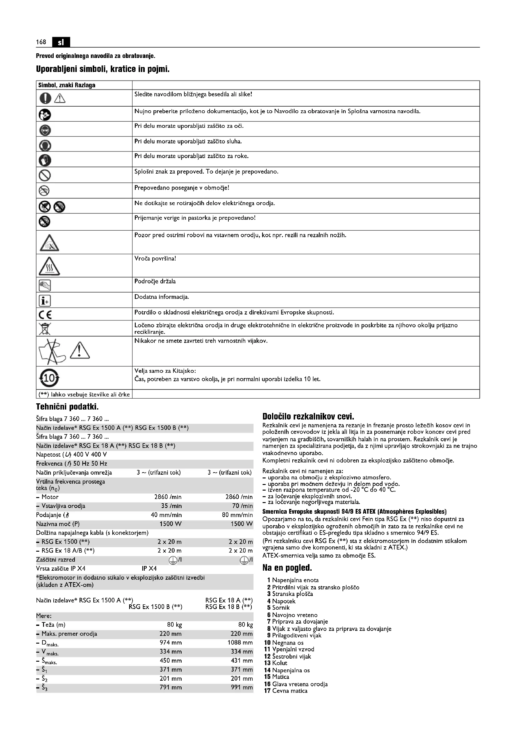 Opozarjamo na to, da rezkalniki cevi Fein tipa RSG Ex (^**) niso dopustni za uporabo v eksplozijsko ogrozenih obmojih in zato za te rezkalnike cevi ne obstajao certifikat o ES-pregledu tipa skladno s smernico 94/9 ES.