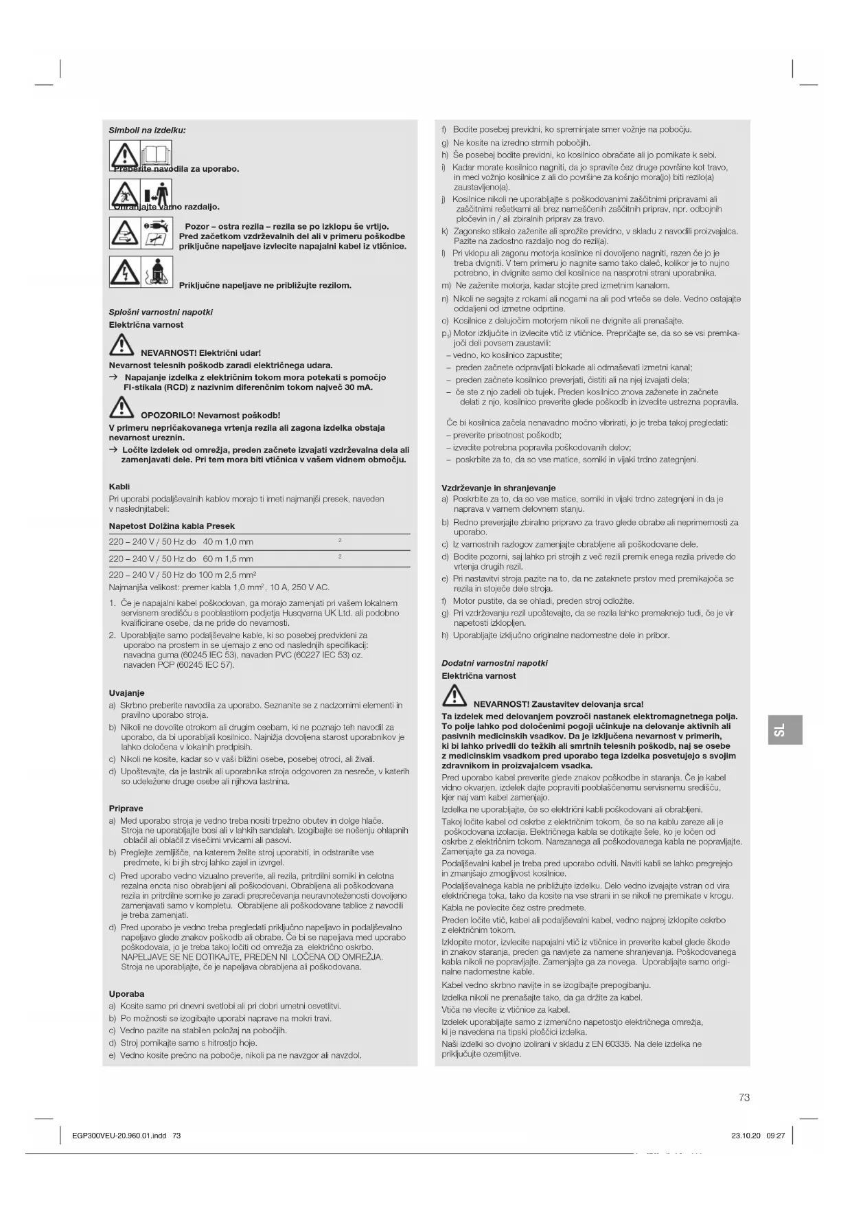 uporabona prostem in se ujemajo z eno od naslednjih specifikacij: navadnaguma (60245 IEC 53), navaden PVC (60227 IEC 53) oz. navadenPCP (60245 IEC 57). Uvajanje a) Skrbno preberite navodila za uporabo. Seznanite se z nadzornimi elementi in pravilno uporabo stroja. b) Nikoli ne dovolite otrokom ali drugim osebam, ki ne poznajo teh navodil za uporabo, da bi uporabljali kosilnico. Najnižja dovoljena starost uporabnikov je lahko določena v lokalnih predpisih. c) Nikoli ne kosite, kadar so v vaši bližini osebe, posebej otroci, ali živali. d) Upoštevajte, da je lastnik ali uporabnika stroja odgovoren za nesreče, v katerih so udeležene druge osebe ali njihova lastnina. Priprave a) Med uporabo stroja je vedno treba nositi trpežno obutev in dolge hlače. Stroja ne uporabljajte bosi ali v lahkih sandalah. Izogibajte se nošenju ohlapnih oblačil ali oblačil z visečimi vrvicami ali pasovi. b) Preglejte zemljišče, na katerem želite stroj uporabiti, in odstranite vse predmete, ki bi jih stroj lahko zajel in izvrgel. c) Pred uporabo vedno vizualno preverite, ali rezila, pritrdilni sorniki in celotna rezalna enota niso obrabljeni ali poškodovani. Obrabljena ali poškodovana rezila in pritrdilne sornike je zaradi preprečevanja neuravnoteženosti dovoljeno zamenjavati samo v kompletu. Obrabljene ali poškodovane tablice z navodili je treba zamenjati. d) Pred uporabo je vedno treba pregledati priključno napeljavo in podaljševalno napeljavo glede znakov poškodb ali obrabe. Če bi se napeljava med uporabo poškodovala, jo je treba takoj ločiti od omrežja za električno oskrbo. NAPELJAVE SE NE DOTIKAJTE, PREDEN NI LOČENA OD OMREŽJA. Stroja ne uporabljajte, če je napeljava obrabljena ali poškodovana. Uporaba a) Kosite samo pri dnevni svetlobi ali pri dobri umetni osvetlitvi. b) Po možnosti se izogibajte uporabi naprave na mokri travi. c) Vedno pazite na stabilen položaj na pobočjih. d) Stroj pomikajte samo s hitrostjo hoje. e) Vedno kosite prečno na pobočje, nikoli pa ne navzgor ali navzdol. f) Bodite posebej previdni, ko spreminjate smer vožnje na pobočju. g) Ne kosite na izredno strmih pobočjih. h) Še posebej bodite previdni, ko kosilnico obračate ali jo pomikate k sebi.