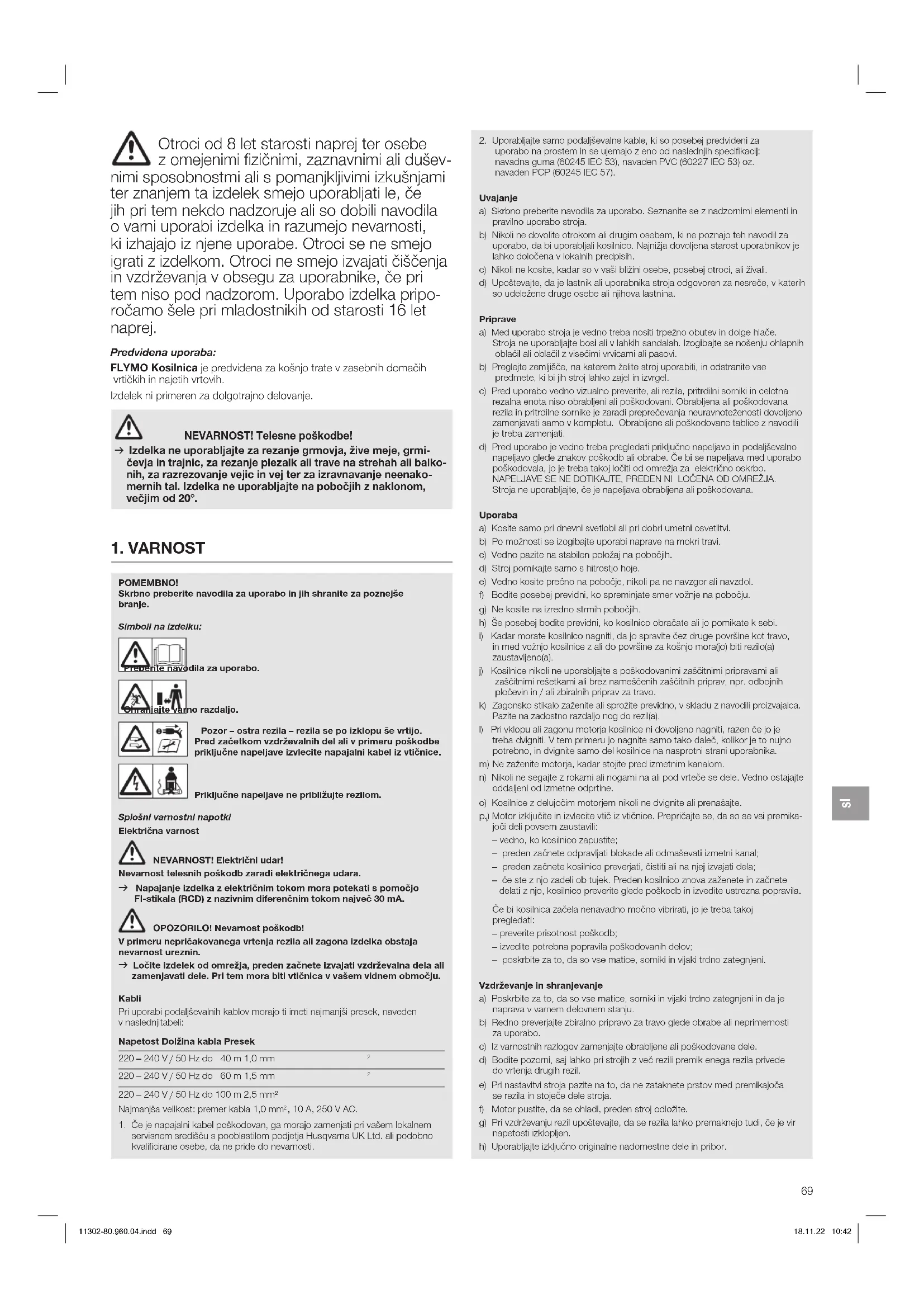 Otroci od 8 let starosti naprej ter osebe zomejenimi fizičnimi, zaznavnimi ali dušev- nimi sposobnostmi ali s pomanjkljivimi izkušnjami ter znanjem ta izdelek smejo uporabljati le, če jihpri tem nekdo nadzoruje ali so dobili navodila ovarni uporabi izdelka in razumejo nevarnosti, kiizhajajo iz njene uporabe. Otroci se ne smejo igrati z izdelkom. Otroci ne smejo izvajati čiščenja in vzdrževanja v obsegu za uporabnike, če pri temniso pod nadzorom. Uporabo izdelka pripo- ročamo šele pri mladostnikih od starosti 16 let naprej. Predvidena uporaba: FLYMO Kosilnica je predvidena za košnjo trate v zasebnih domačih vrtičkih in najetih vrtovih. Izdelek ni primeren za dolgotrajno delovanje. NEVARNOST! Telesne poškodbe! v Izdelka ne uporabljajte za rezanje grmovja, žive meje, grmi- čevja in trajnic, za rezanje plezalk ali trave na strehah ali balko- nih, za razrezovanje vejic in vej ter za izravnavanje neenako- mernih tal. Izdelka ne uporabljajte na pobočjih z naklonom, večjim od 20°.