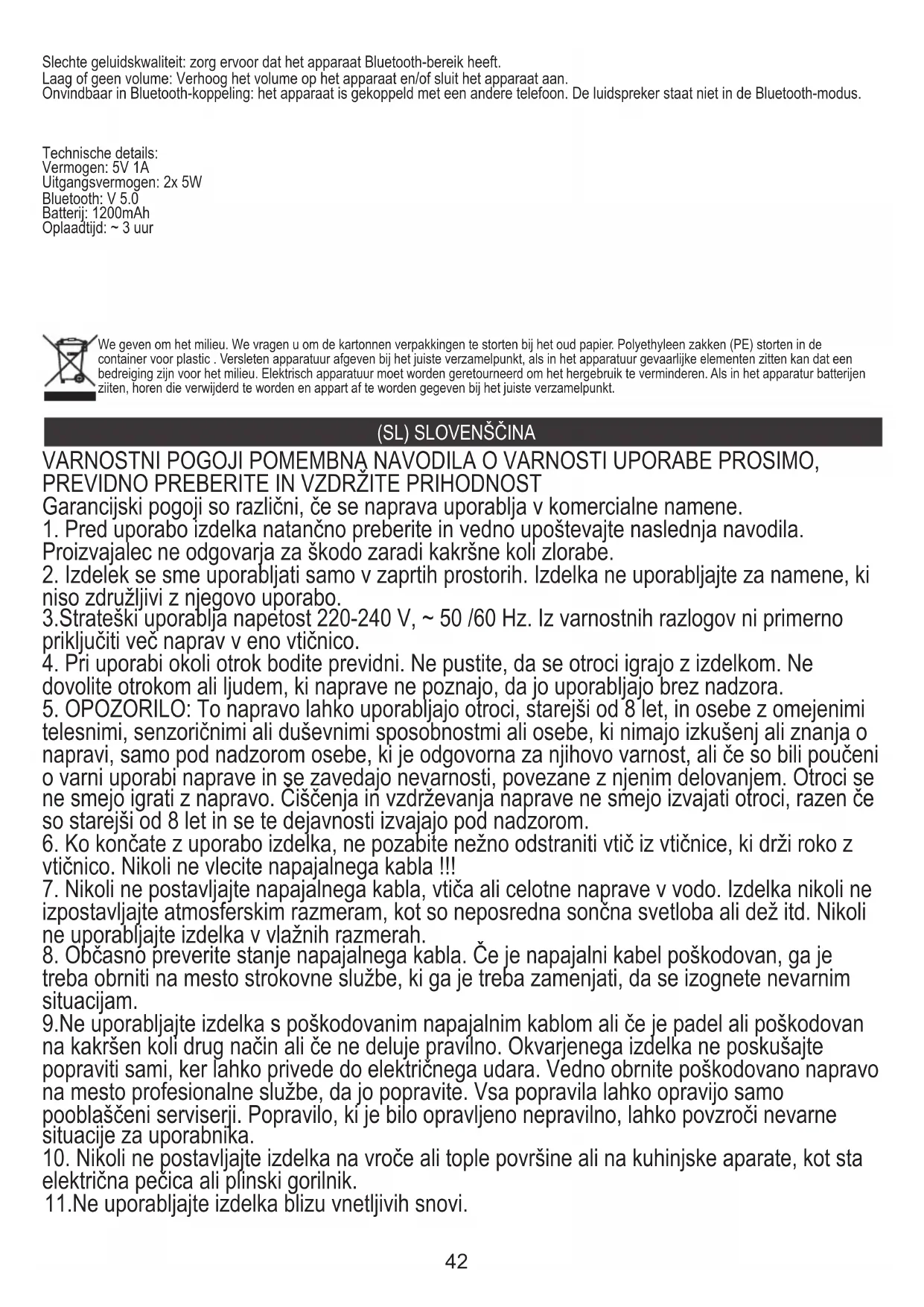 Baterija: 1200mAh Napajanje: 5V 1A Ni mogoče odkriti pri seznanjanju Bluetooth: naprava je seznanjena z drugim telefonom. Zvočnik ni v načinu Bluetooth. Bluetooth: V 5.0 Izhodna moč: 2x 5W Slaba kakovost zvoka: Preverite, ali je naprava v dosegu Bluetooth. Nizka ali brez glasnosti: Povečajte glasnost na napravi in/ali povežite napravo. Skrbimo za okolje. Kartonska embalaža, prosim darovati na odpadni papir. Polietilenske vreče (PE) mečite v posoda za plastiko. Dotrajane naprave je treba vrniti na ustrezno zbirno mesto, ker vsebovane v napravo nevarne elemente lahko predstavljajo nevarnost za okolje. Električna naprava je treba vrniti kakor, da se omeji njegovo ponovno uporabo in izkoriščenost. Če naprava vsebuje baterio, je treba odstraniti in ločeno dati nazaj na mesta skladiščenja.45 (HR) HRVATSKI
