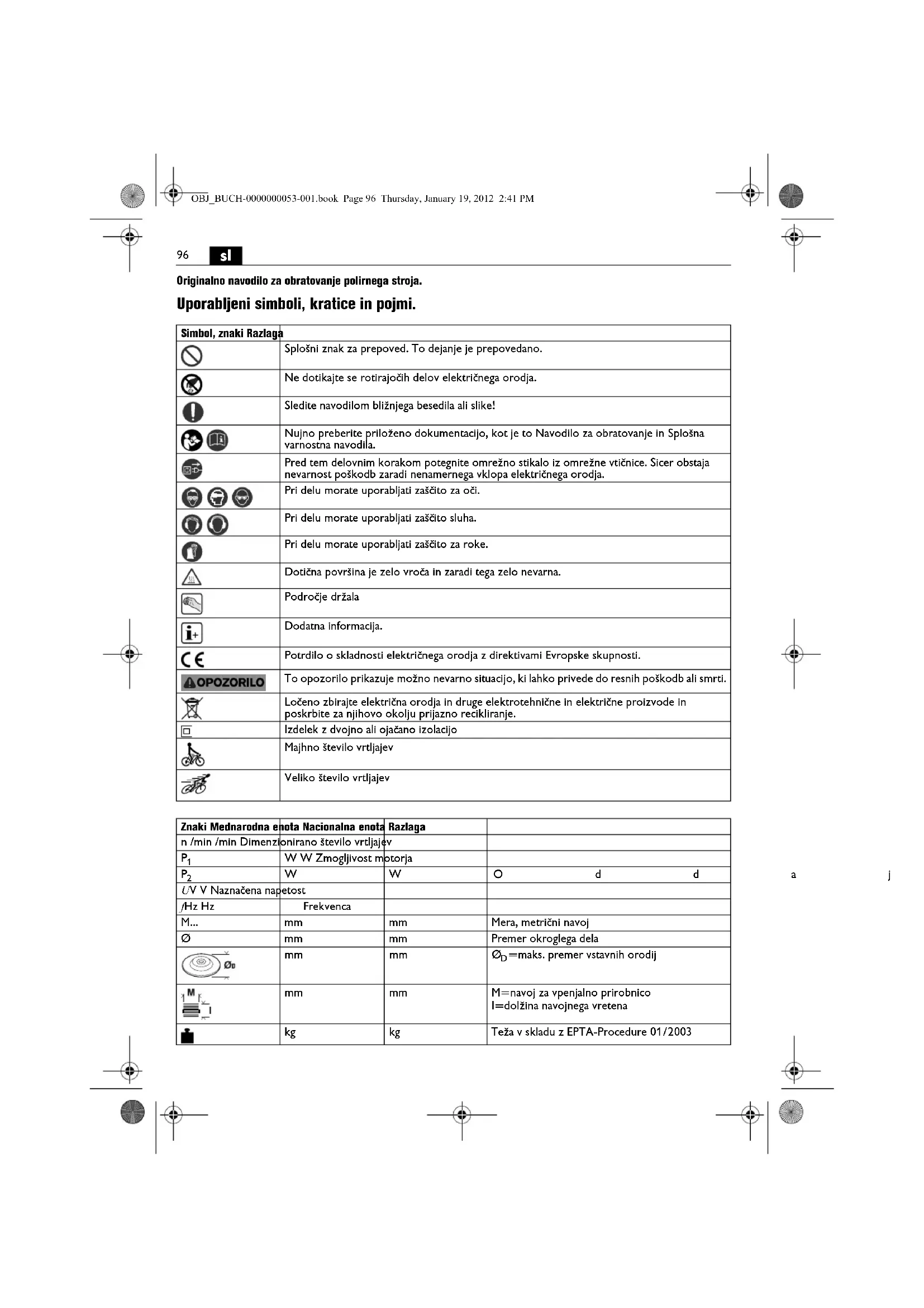 | m, s, kg, A, mm, V, W, Hz, N, °C, dB, min, m/s2 | m, s, kg, A, mm, V, W, Hz, N, °C, dB, min, m/s2 | Osnovne i izvedene jedinice iz Medunarodnog sustava jedinica SL. | |
